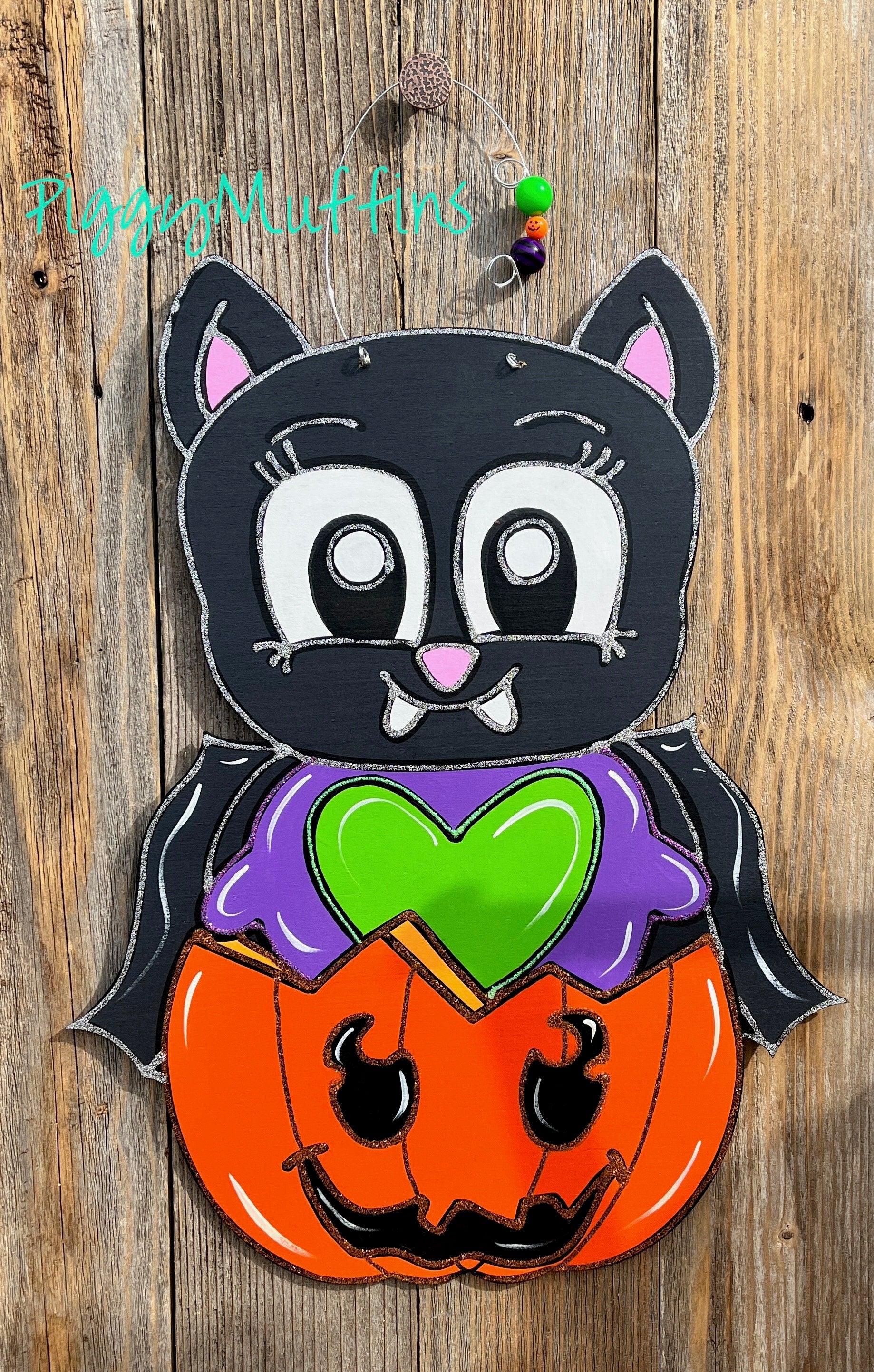 This adorable spooky bat door hanger by PiggyMuffins is perfect for the spooky season! Welcome your trick-or-treaters with this one of a kind Halloween door decor! It measures approximately 22 inches in length and 22 inches in width. This sign is cut out of 1/4 inch board, sanded and painted with acrylic paint and accented with polyester glitter. It is sealed with a clear protective coating that prevents chipping, peeling, fading, or yellowing. It includes a sturdy wire hanger and coordinating beads, and is ready to hang when delivered.