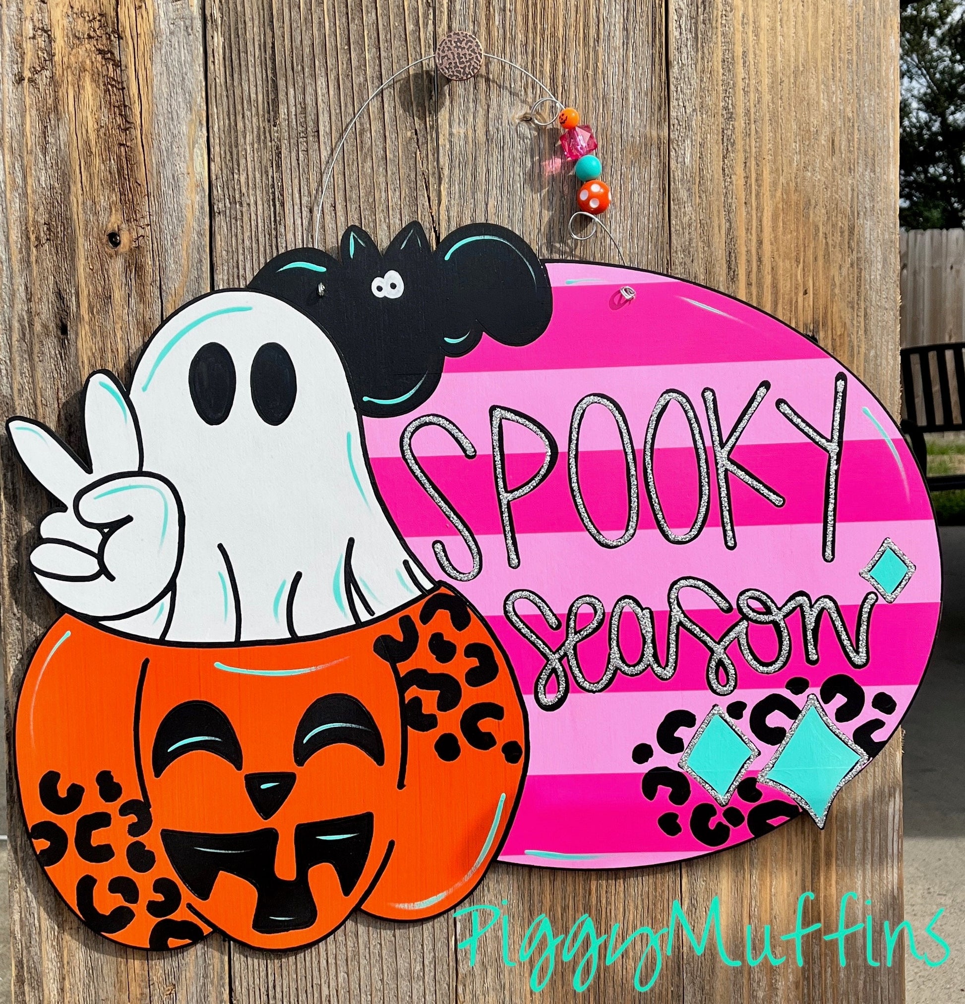 This adorable retro inspired Halloween door hanger by PiggyMuffins is perfect for the spooky season! Welcome your trick-or-treaters with this one of a kind Halloween Door Decor! It measures approximately 20 inches in length and 22 inches in width. This sign is cut out of 1/4 inch board, sanded and painted with acrylic paint and accented with polyester glitter. It is sealed with a clear protective coating that prevents chipping, peeling, fading, or yellowing. It includes a sturdy wire hanger and coordinating beads, and is ready to hang when delivered.