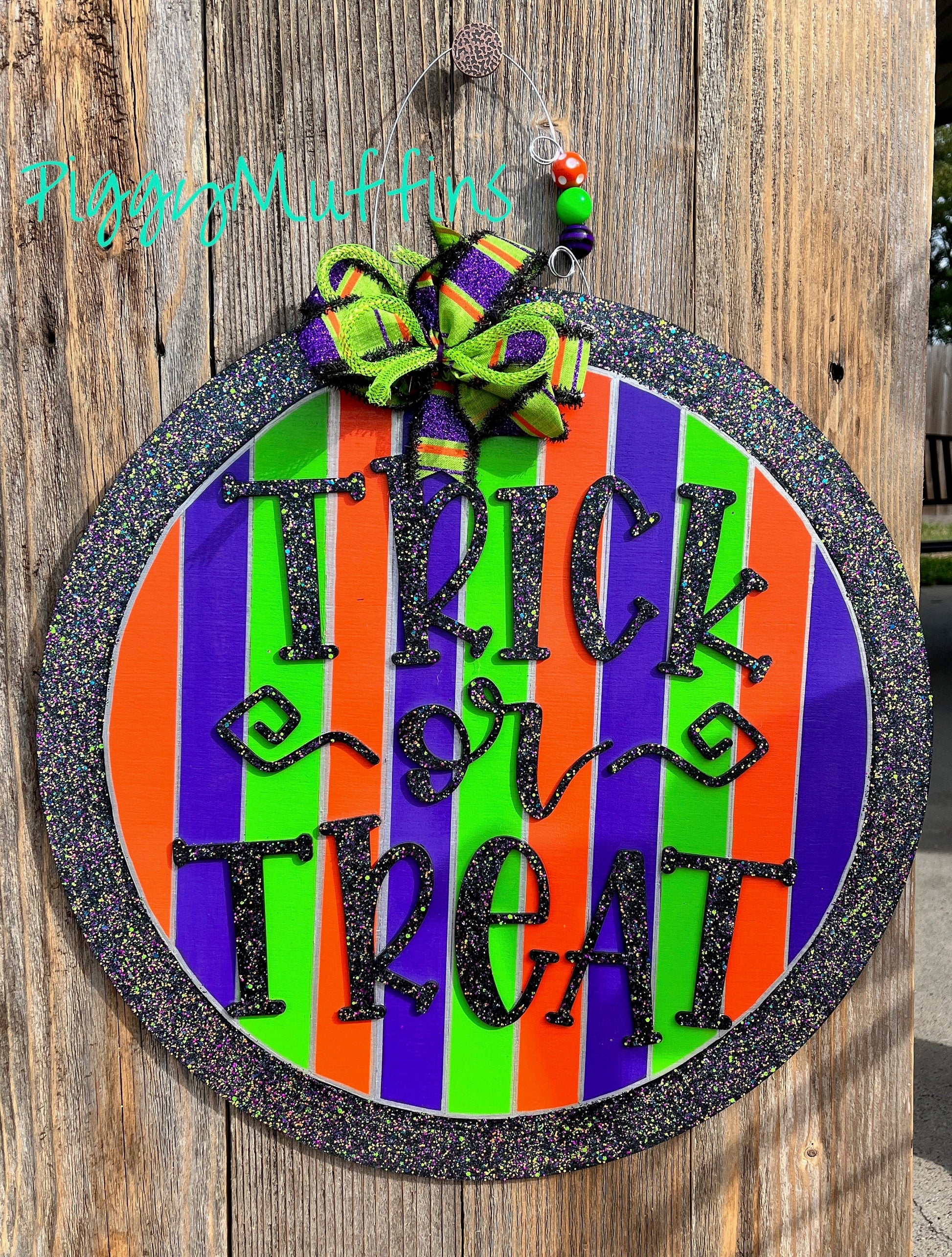 This adorable bright and bold Trick or Treat door hanger by PiggyMuffins is perfect for the spooky season! Welcome your trick-or-treaters with this one of a kind Halloween door decor! It measures approximately 21 inches round. This sign is cut out of 1/4 inch board, sanded and painted with acrylic paint and accented with polyester glitter. It is sealed with a clear protective coating that prevents chipping, peeling, fading, or yellowing. It includes a sturdy wire hanger and coordinating beads, and is ready to hang when delivered.