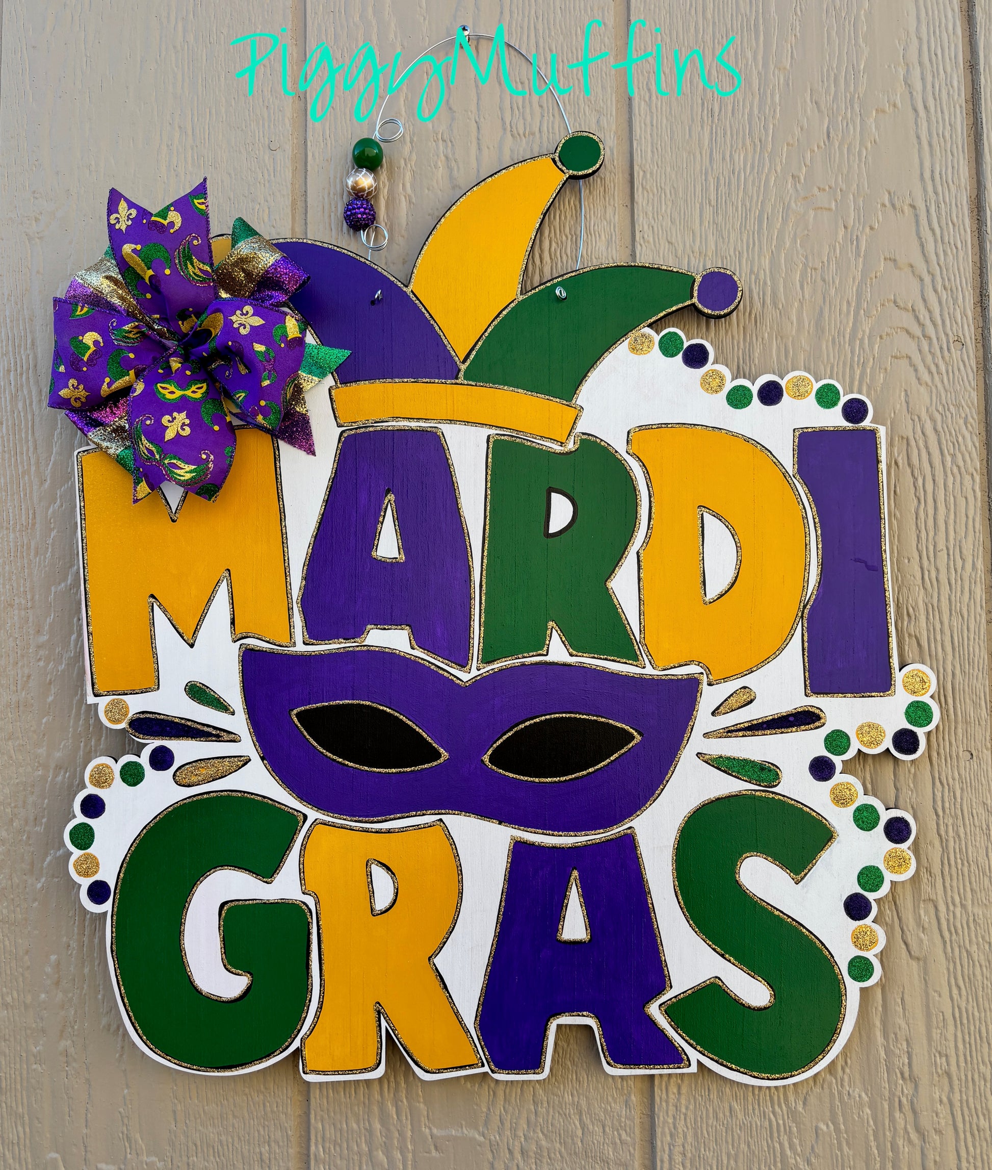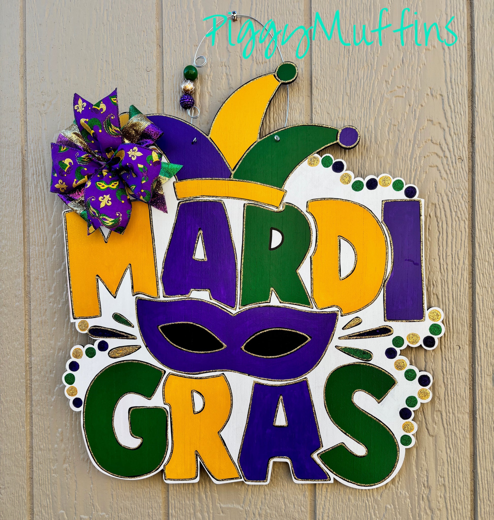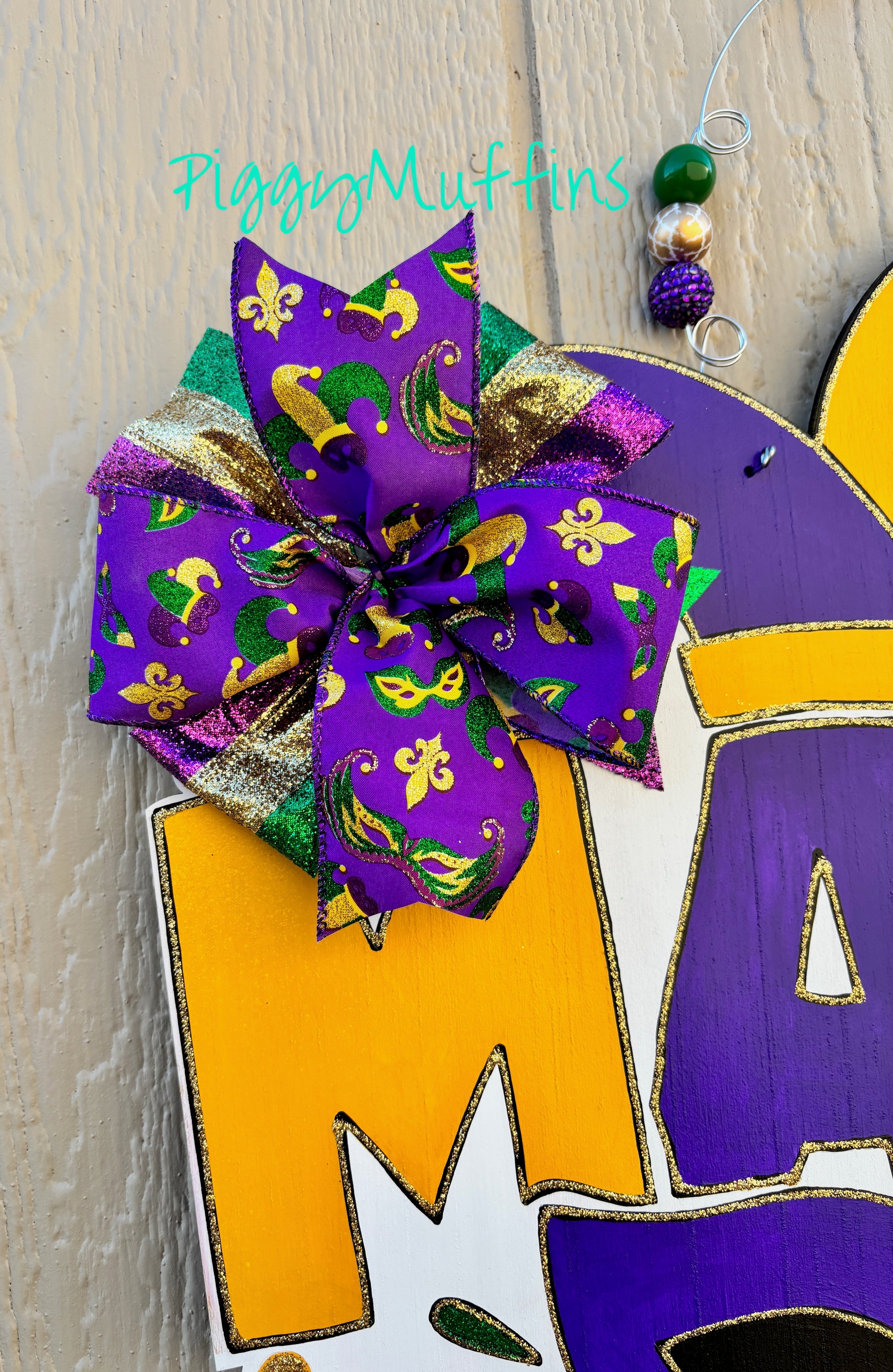 Laissez les bons temps rouler!! Get ready to let the good times roll with this gorgeous Mardi Gras door hanger by PiggyMuffins! This Mardi Gras Sign measures approximately 22 inches in length and 22 inches in width. This sign is cut out of 1/4 inch board, sanded and painted with acrylic paint and accented with polyester glitter. It is sealed with a clear protective coating that prevents chipping, peeling, fading, or yellowing. It includes a sturdy wire hanger, bow and coordinating beads and is ready to hang when delivered.