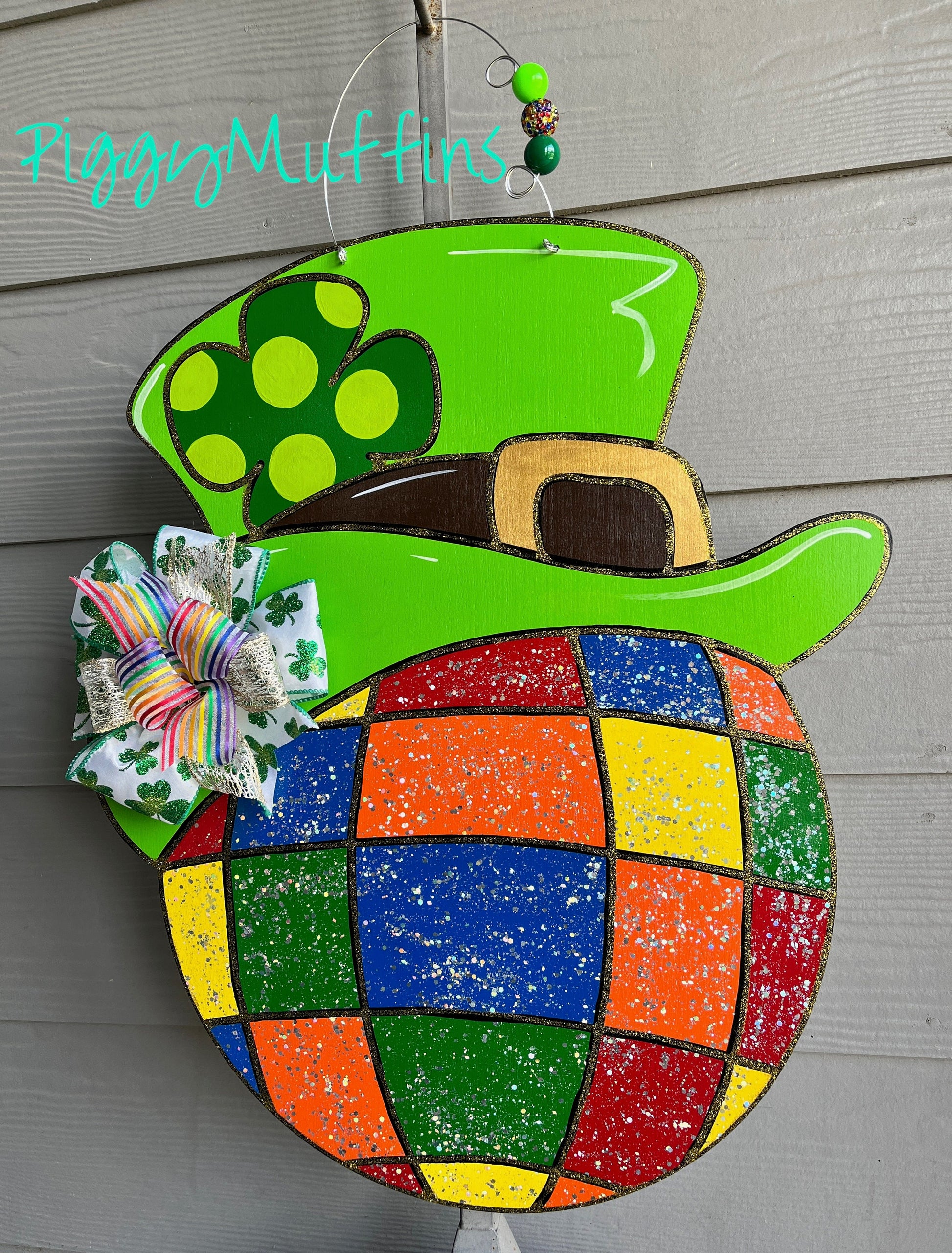 Welcome spring with this adorable St. Patrick's Day doorhanger from PiggyMuffins! This bold mirror ball door decor measures approximately 22 inches in length and 22 inches in width. This sign is cut out of 1/4 inch board, sanded and painted with acrylic paint and accented with polyester glitter. It is sealed with a clear protective coating that prevents chipping, peeling, fading, or yellowing. It includes a sturdy wire hanger and coordinating bow and beads and is ready to hang when delivered.