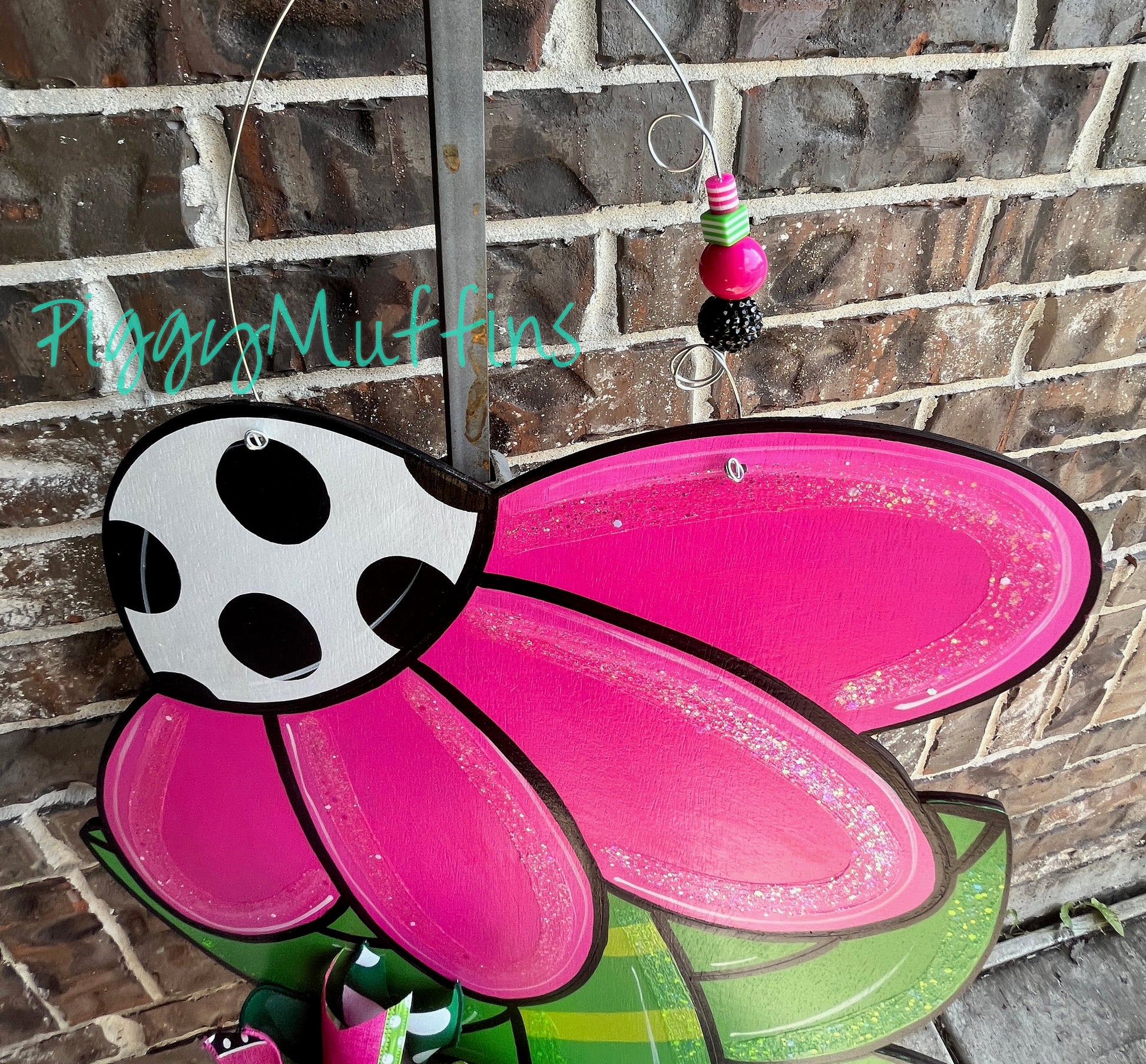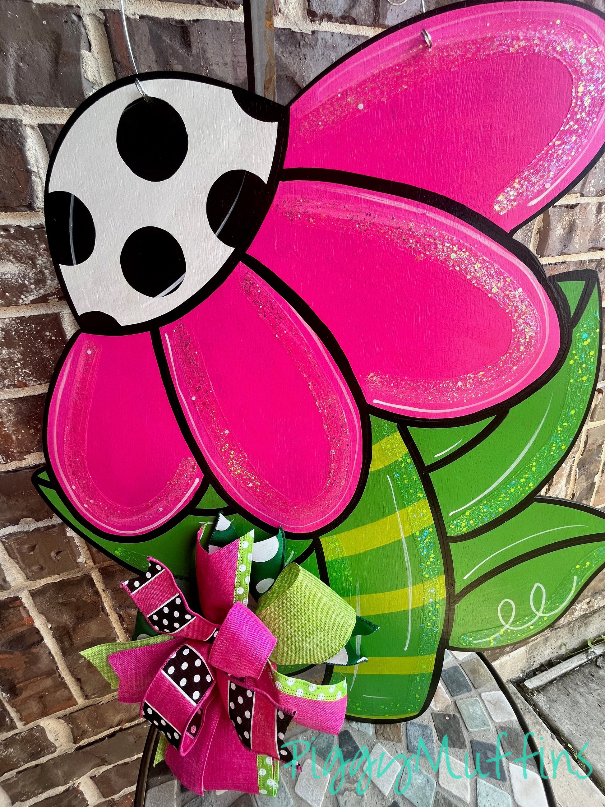 How gorgeous is this bright pink floral door hanger by PiggyMuffins?? Perfect all spring long, it measures approximately 22 inches in length and 20 inches in width. This Spring Door Hanger is cut out of 1/4 inch birch, sanded and painted with acrylic paint. It is sealed with a clear protective coating that prevents chipping, peeling, fading, or yellowing. Accented with glitter, it includes a sturdy wire hanger with a coordinating beads and is ready to hang when delivered. A coordinating bow can be added for an additional charge by choosing the "With Bow" option at checkout.