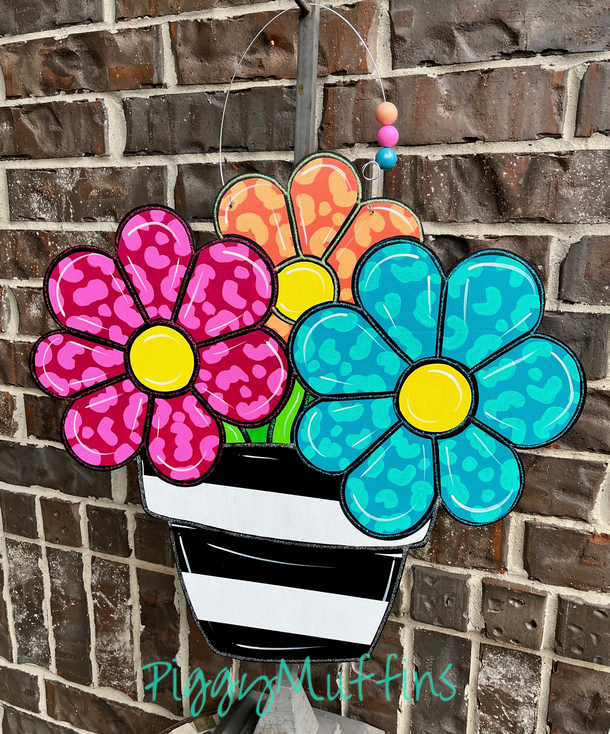 How gorgeous is this bright floral door hanger by PiggyMuffins?? Perfect all spring and/or summer long, this Spring Door Hanger measures approximately 22 inches in length and 22 inches in width. This sign is cut out of 1/4 inch birch, sanded and painted with acrylic paint. It is sealed with a clear protective coating that prevents chipping, peeling, fading, or yellowing. Accented with glitter, it includes a sturdy wire hanger with a coordinating beads and is ready to hang when delivered. A coordinating bow can be added for an additional charge by choosing the "With Bow" option at checkout.