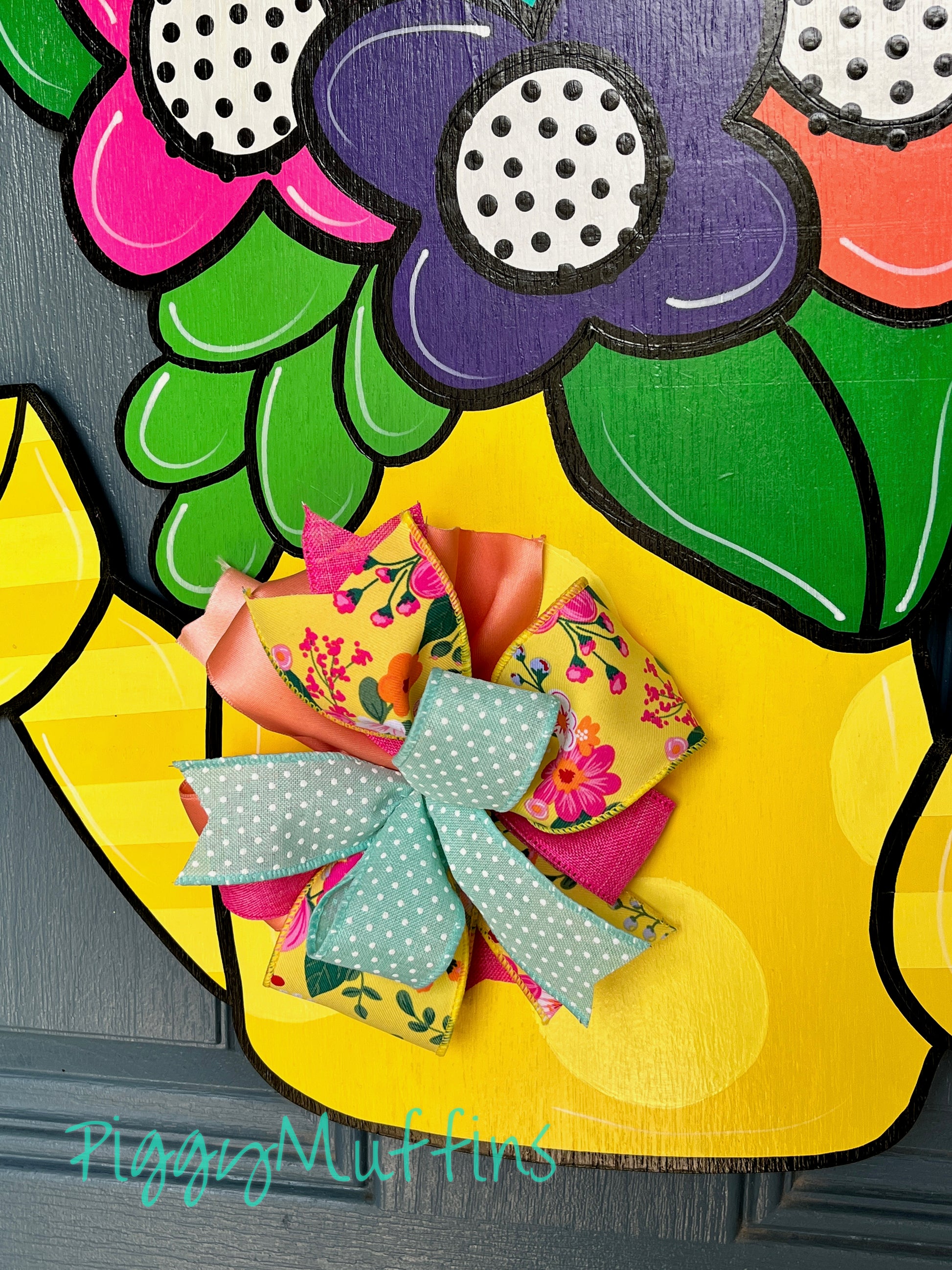 How gorgeous is this floral watering can door hanger by PIggyMuffins?? Perfect all spring long, this Spring Door Hanger measures approximately 22 inches in length and 20 inches in width. This sign is cut out of 1/4 inch birch, sanded and painted with acrylic paint. It is sealed with a clear protective coating that prevents chipping, peeling, fading, or yellowing. It includes a sturdy wire hanger with coordinating beads and is ready to hang when delivered. A coordinating bow can be added for an additional charge by choosing the "With Bow" option at checkout.