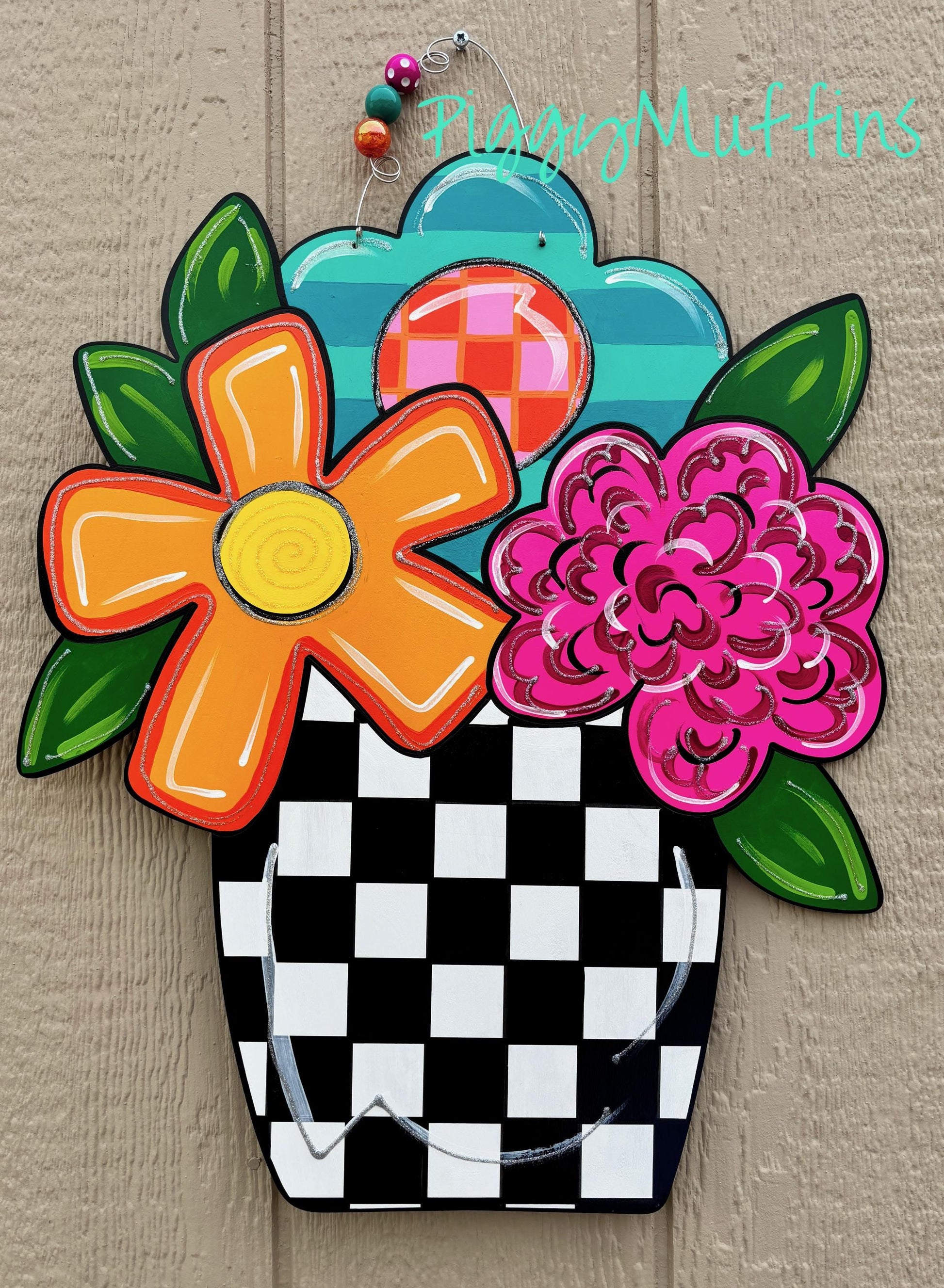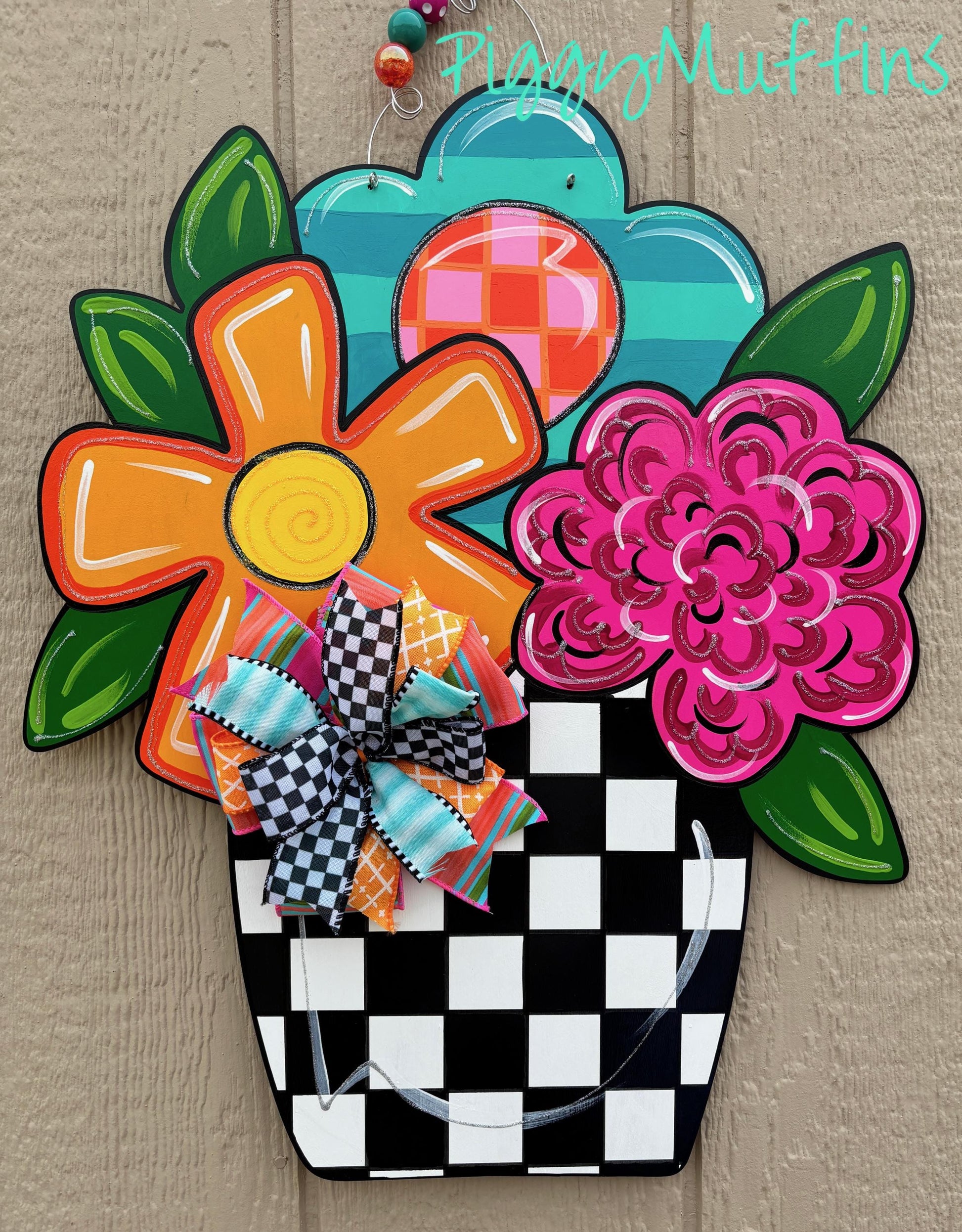 Welcome spring/summer with this gorgeous and bright floral door hanger by PiggyMuffins! This lovely Summer Door Hanger measures approximately 22 inches in length and 20 inches in width. The floral colors are bright and pop against the checkerboard accent. This sign is cut out of 1/4 inch board, sanded and painted with acrylic paint and accented with polyester glitter. It is sealed with a clear protective coating that prevents chipping, peeling, fading, or yellowing. It includes a sturdy wire hanger and is ready to hang when delivered. A coordinating bow can be added for an additional fee at checkout.