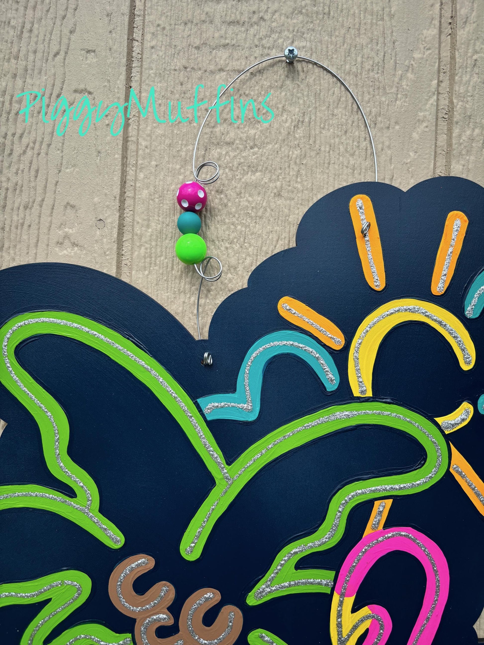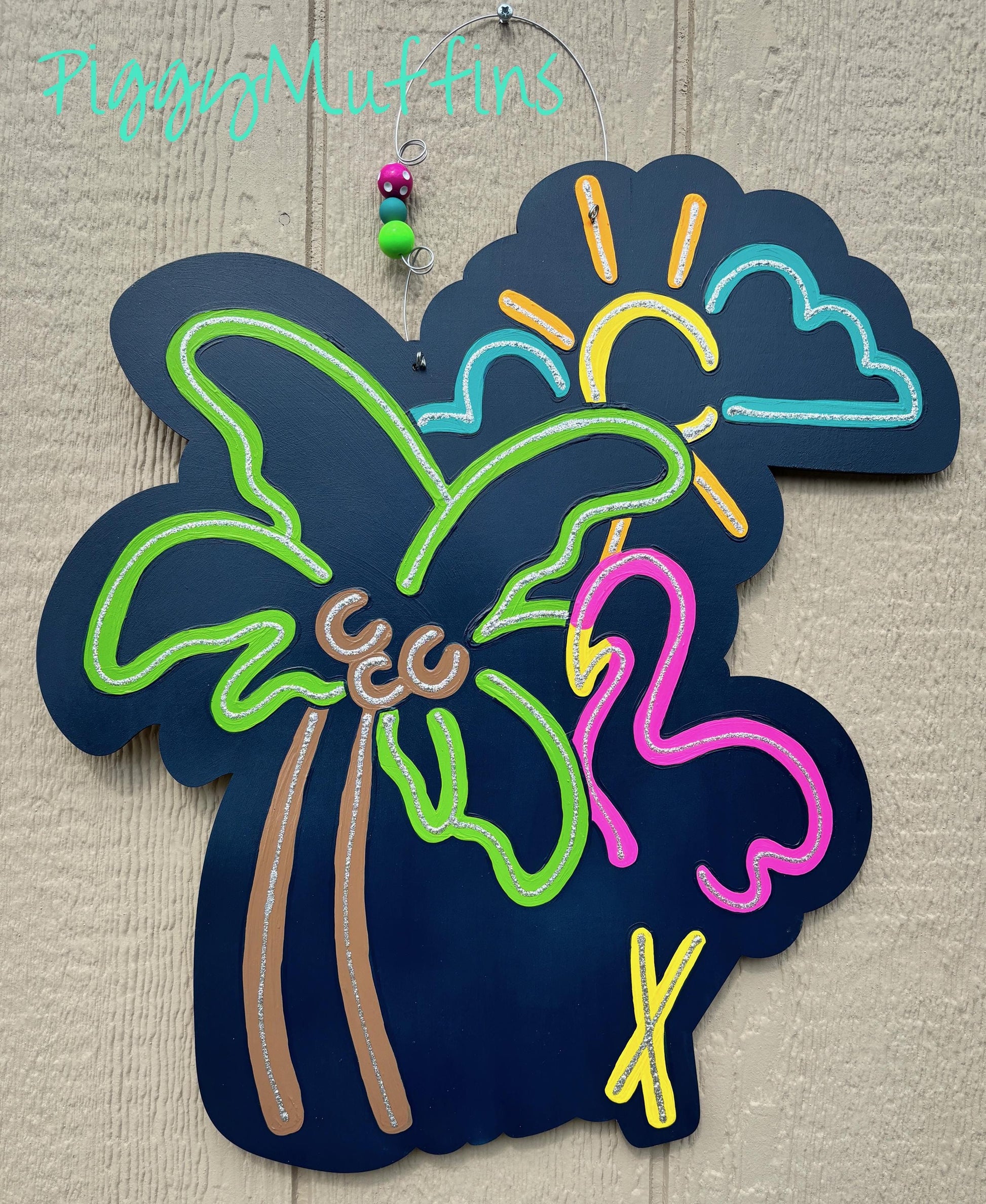 Welcome summer with this gorgeous "neon" flamingo door hanger by PiggyMuffins! The Summer Door Hanger measures approximately 22 inches in length and 20 inches in width. This sign is cut out of 1/4 inch board, sanded and painted with acrylic paint and accented with polyester glitter. This beach wreath is sealed with a clear protective coating that prevents chipping, peeling, fading, or yellowing. It includes a sturdy wire hanger and is ready to hang when delivered. A coordinating bow can be added for an additional fee at checkout.