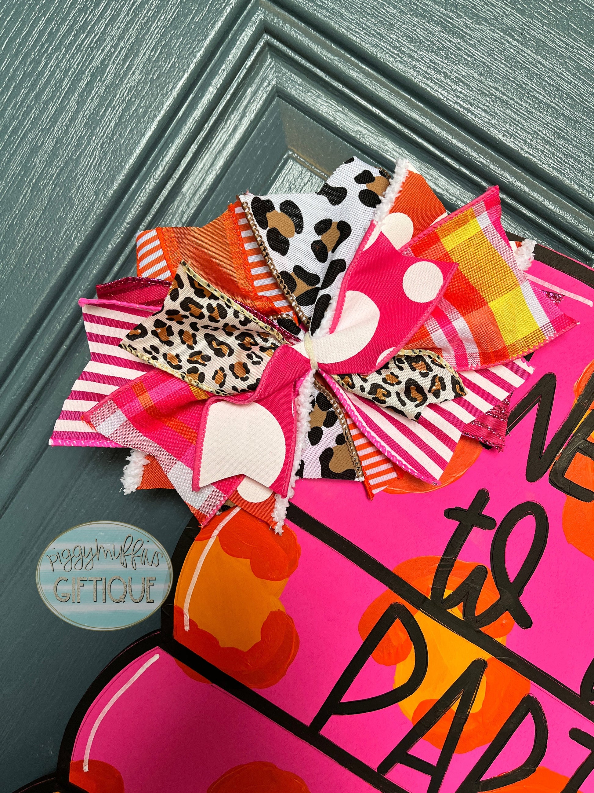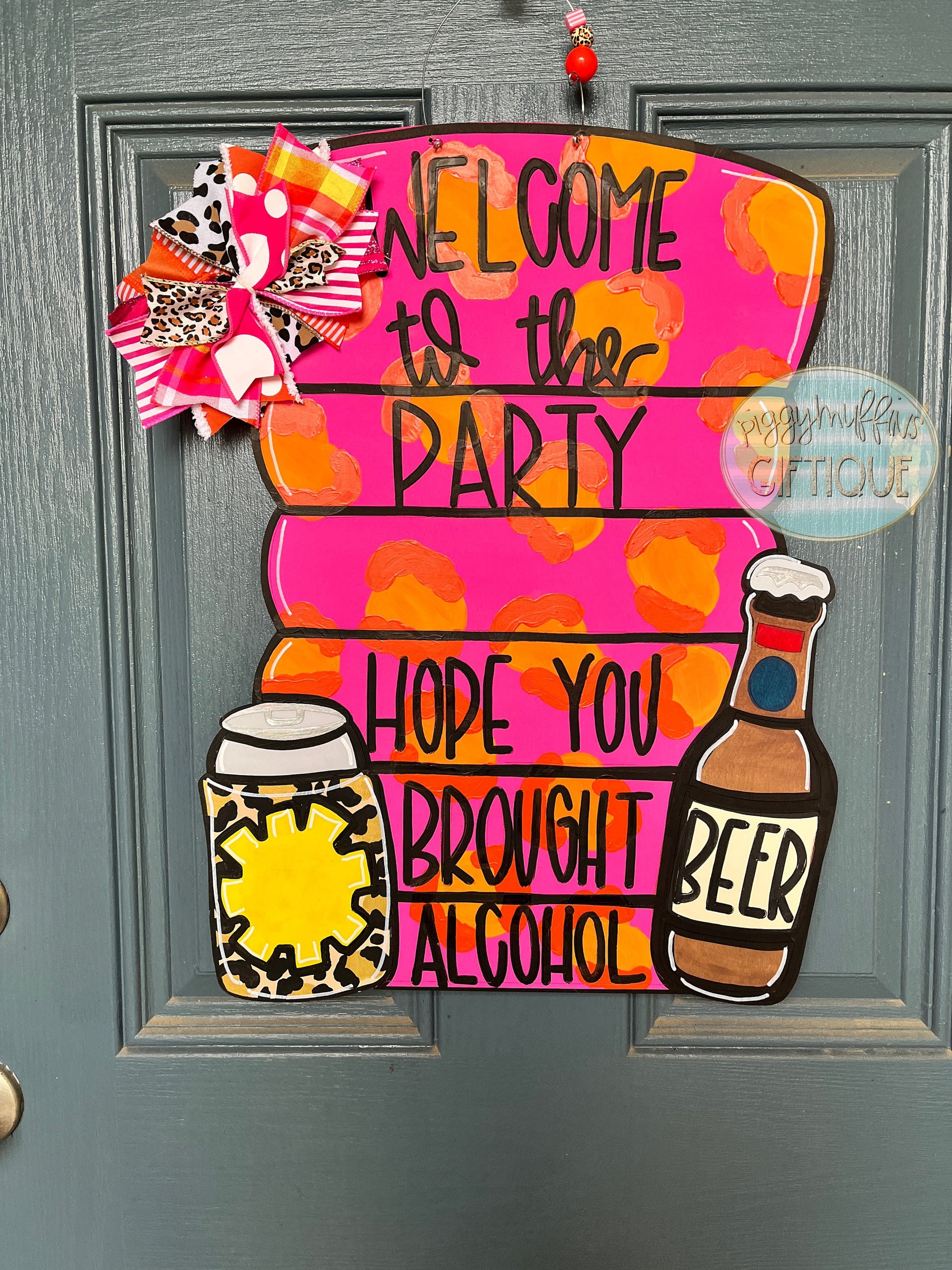 This beachy and bright door hanger from PiggyMuffins will welcome your pool party guests all summer long! This summer door hanger is cut out of 1/4 inch board, sanded and painted with acrylic paint. It is sealed with a clear protective coating that prevents chipping, peeling, fading, or yellowing. It includes a sturdy wire hanger and coordinating beads and is ready to hang when delivered. A coordinating bow can be added for an additional charge by choosing the "With Bow" option at checkout.