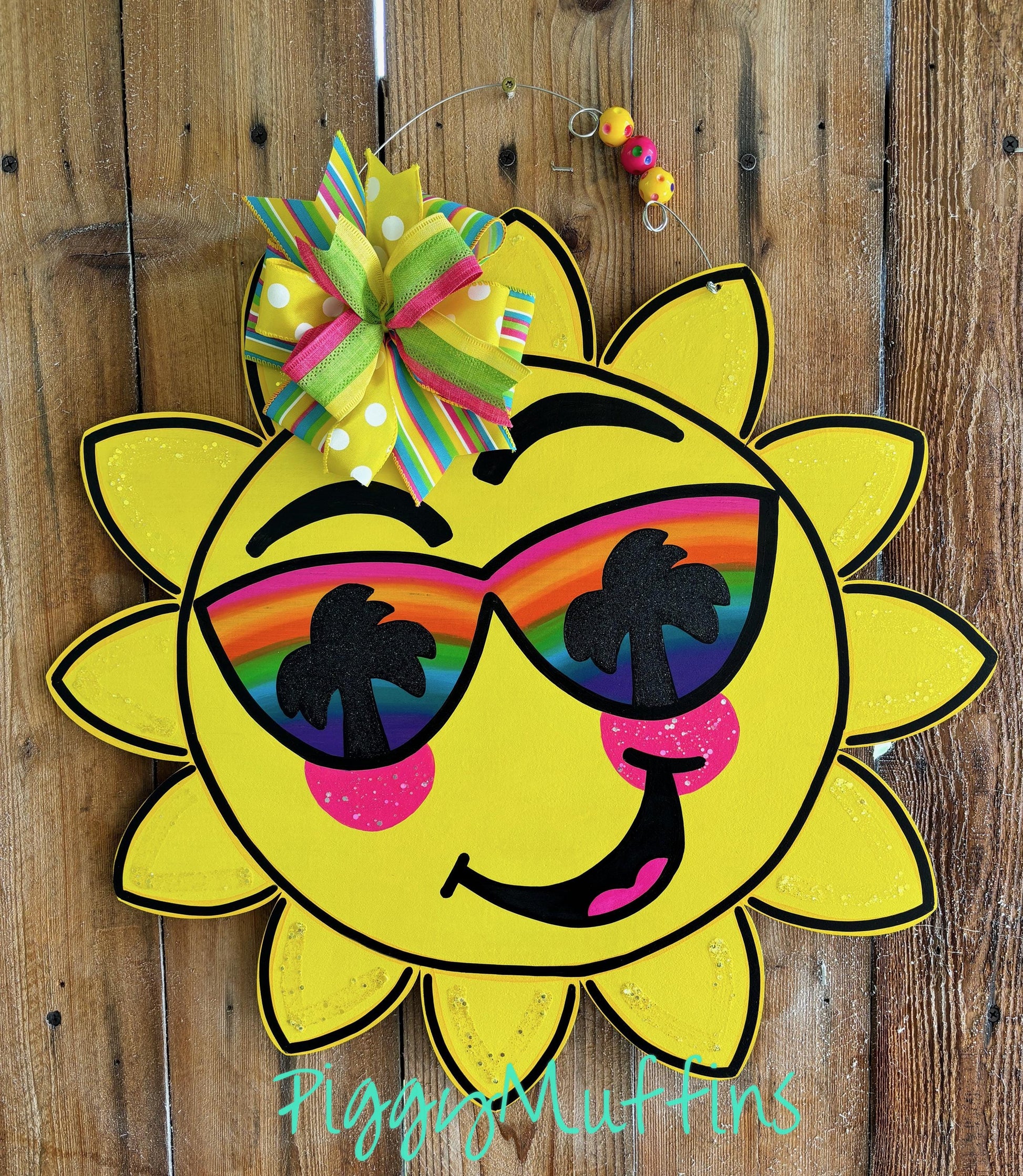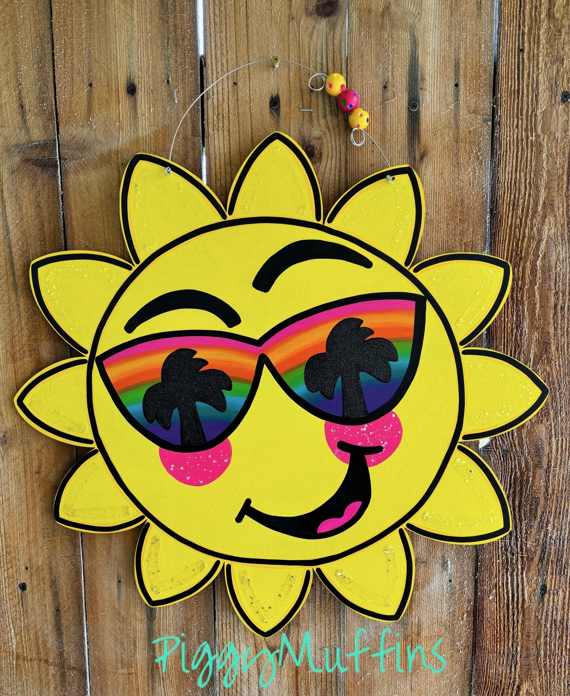 This bright sunshine sunglasses door hanger by PiggyMuffins is perfect all summer long! This is the cutest customized accessory to dress up your front porch decor or backyard patio! Can be used as a beach door hanger, Summer door hanger, or any reason to bring in summer personality. This sign is cut out of 1/4 inch board, sanded and painted with acrylic paint. It is sealed with a clear protective coating that prevents chipping, peeling, fading, or yellowing. It includes a sturdy wire hanger and coordinating beads and is ready to hang when delivered. A coordinating bow can be added for an additional charge by choosing the "With Bow" option at checkout.