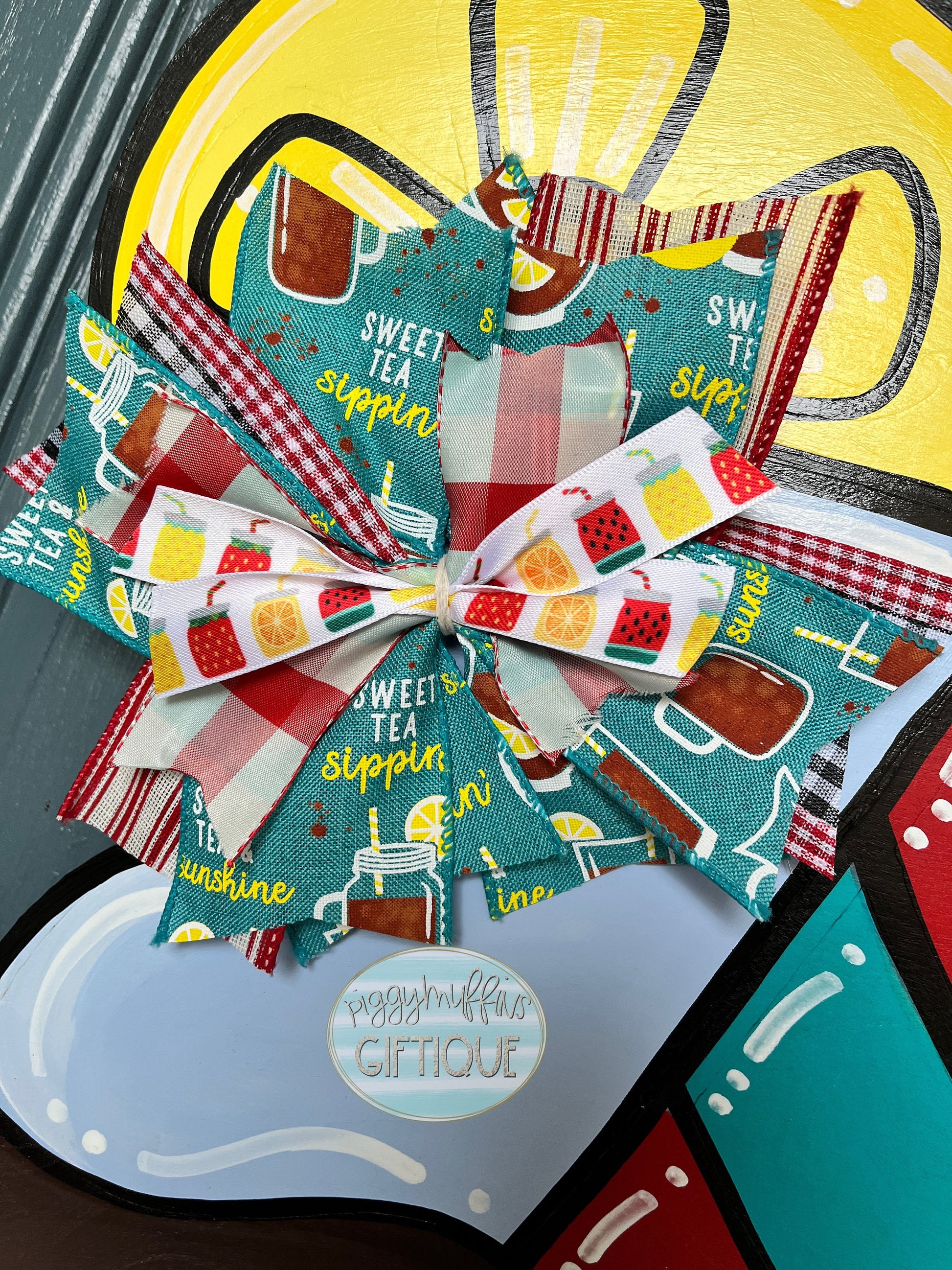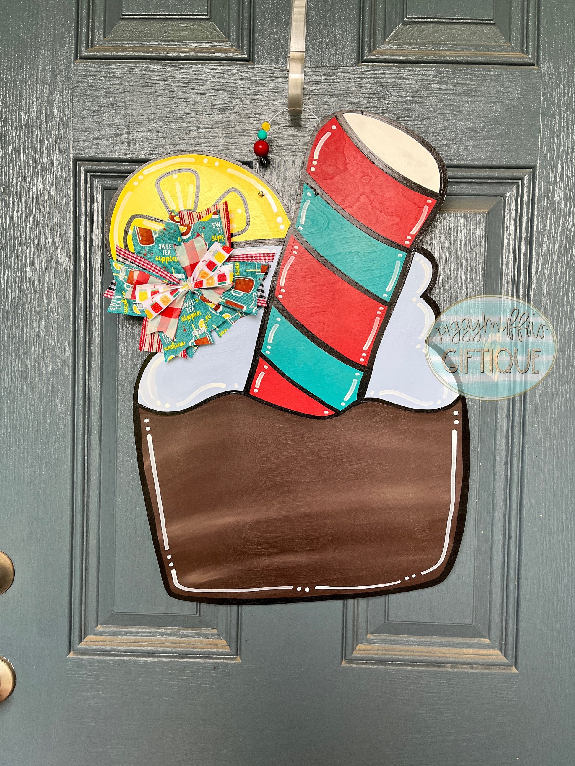 Take time to enjoy the sweet life with this adorable sweet tea door hanger from PiggyMuffins! Personalize to make it truly your own! This Summer door hanger is cut out of 1/4 inch board, sanded and painted with acrylic paint. It is sealed with a clear protective coating that prevents chipping, peeling, fading, or yellowing. It includes a sturdy wire hanger and coordinating bow and is ready to hang when delivered.