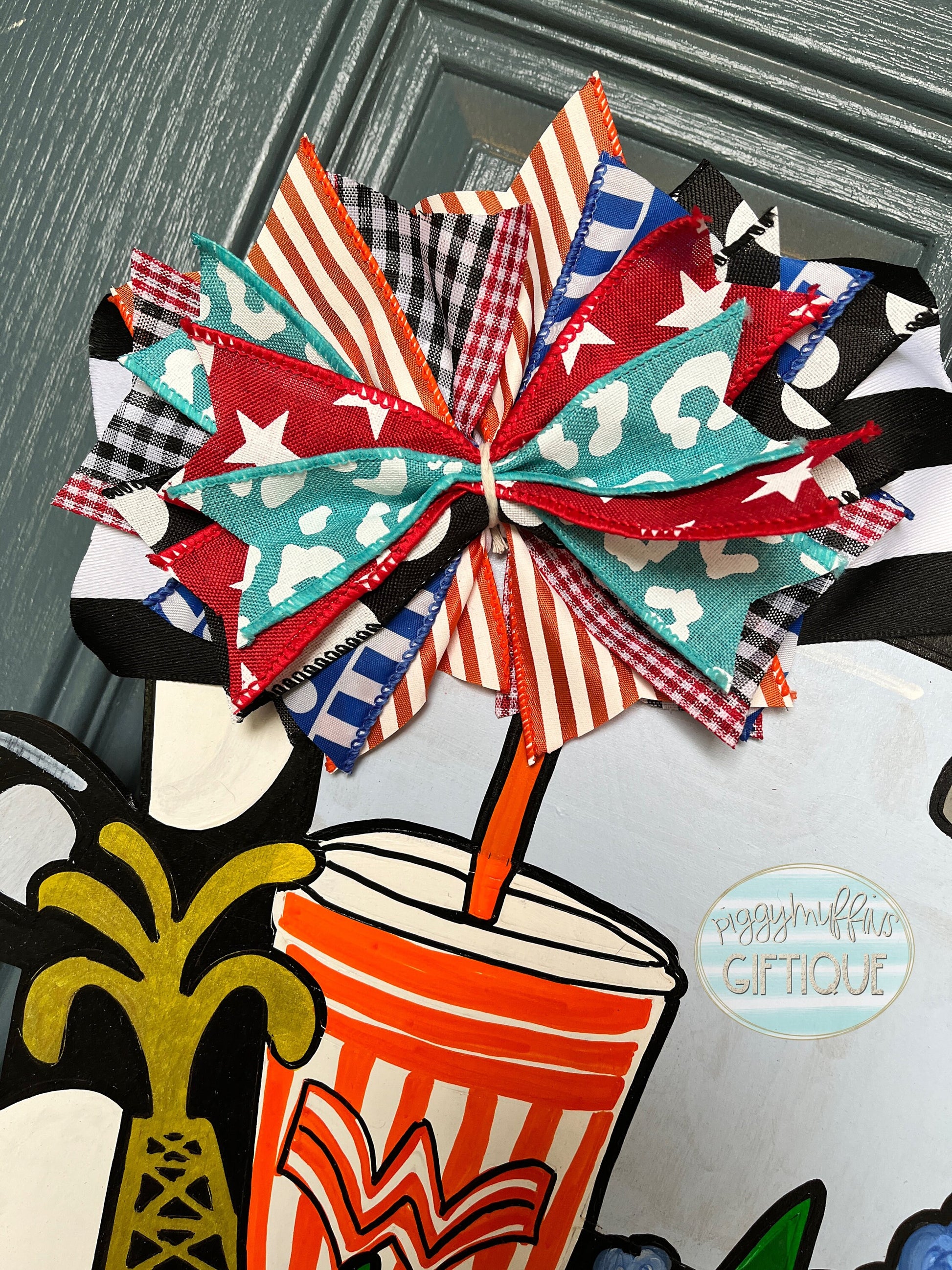 How adorable is this (not so little) Texas truck by PiggyMuffins? It has all your Texas favorites and is perfect all year round! This summer door hanger is cut out of 1/4 inch board, sanded and painted with acrylic paint. It is sealed with a clear protective coating that prevents chipping, peeling, fading, or yellowing. It includes a sturdy wire hanger and coordinating beads and is ready to hang when delivered. A coordinating bow can be added for an additional charge by choosing the "With Bow" option at checkout.