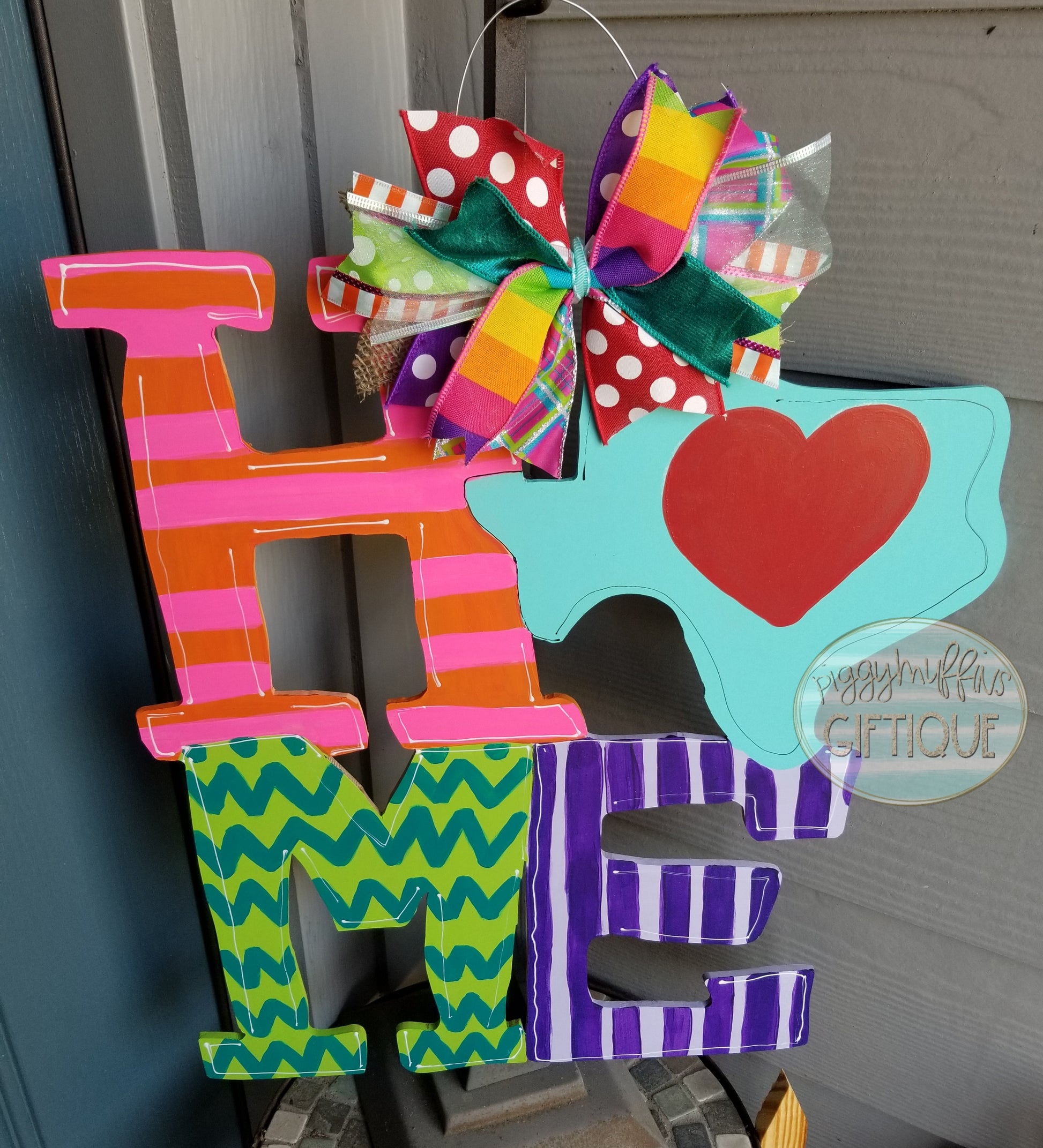 Give your front door pizazz with this Texas HOME door sign by PiggyMuffins! The sign measures 22 inches in length and 22inches in width. This sign is cut out of 1/4 inch birch wood and painted with acrylic paint. It is sealed with a clear protective coating that prevents chipping, peeling, fading, or yellowing. It includes a sturdy wire hanger and coordinating bow and is ready to hang when delivered.