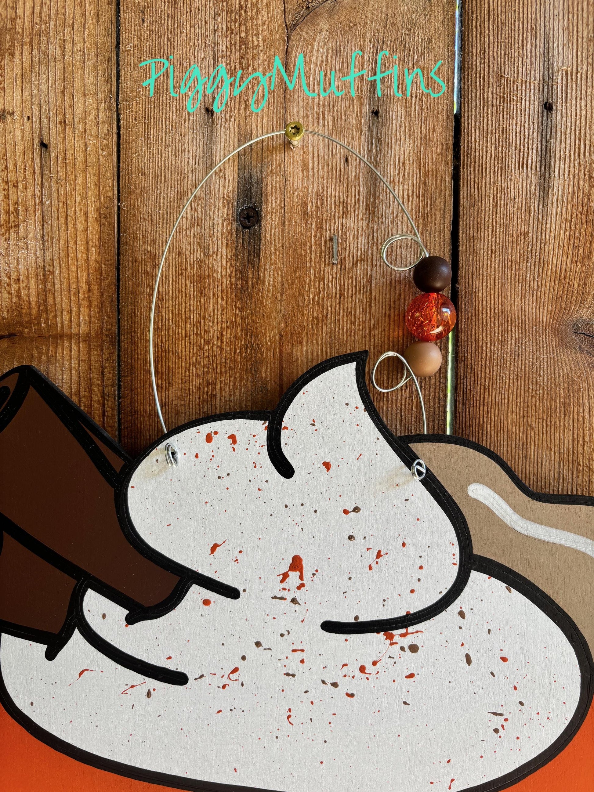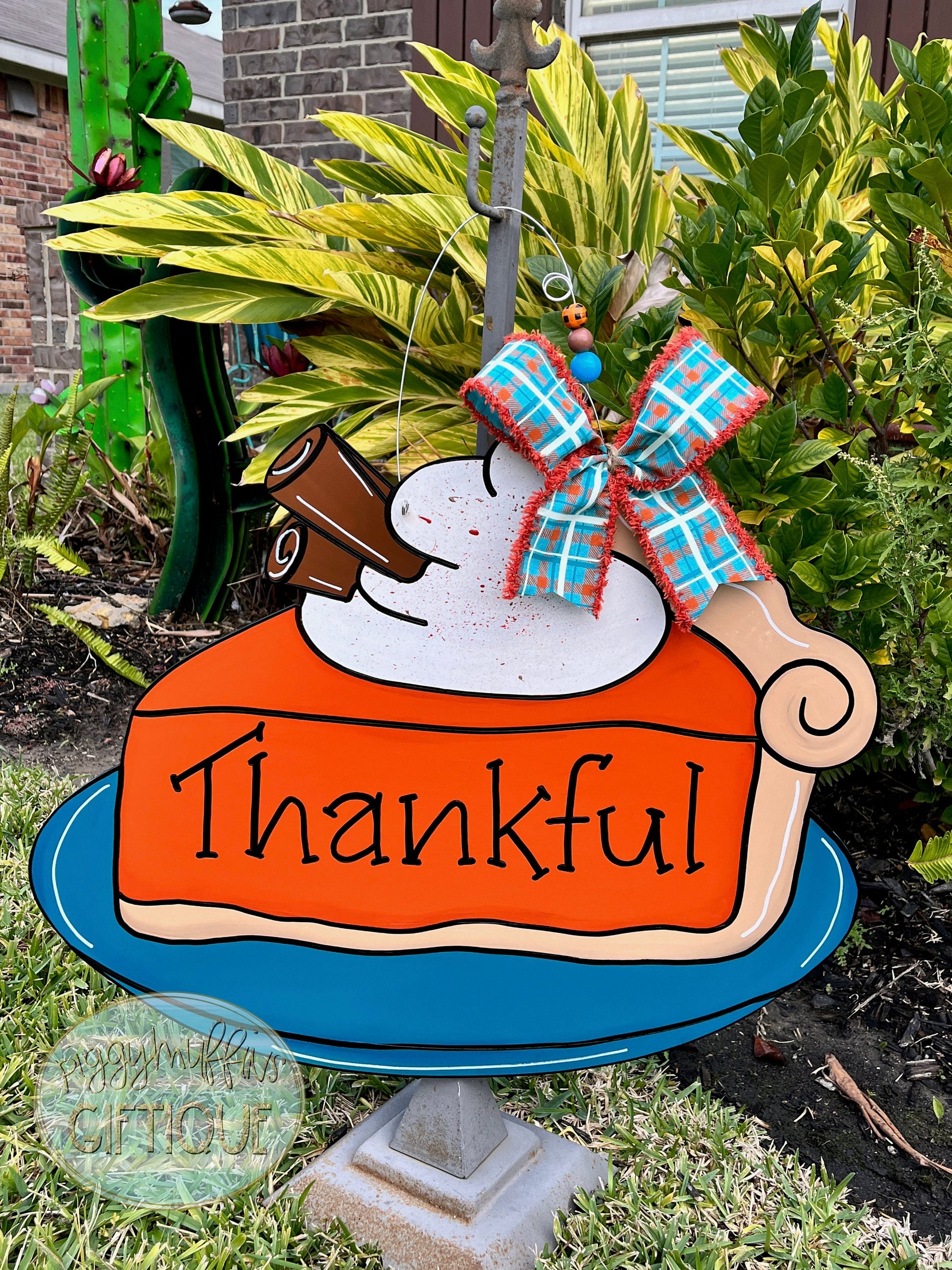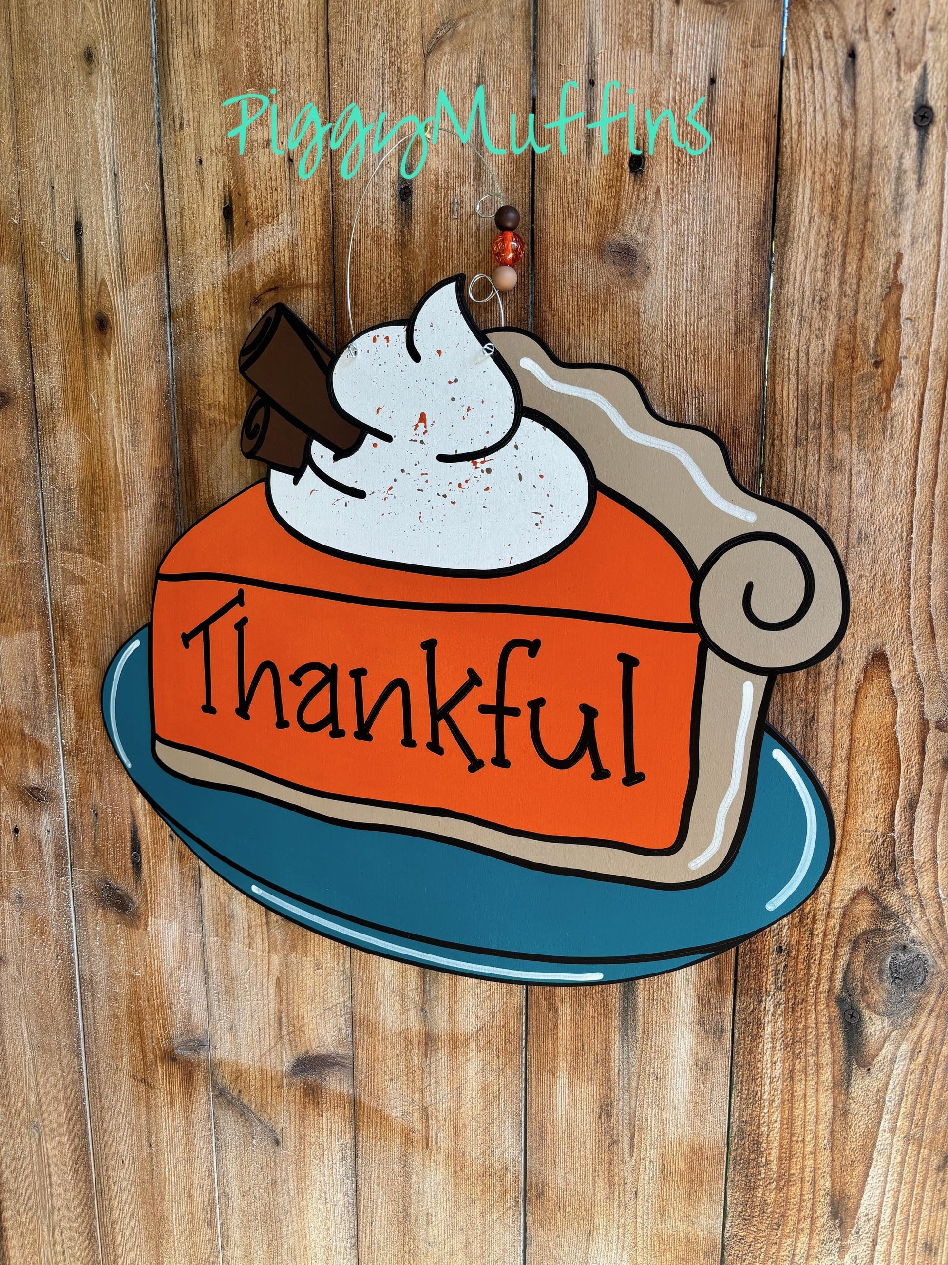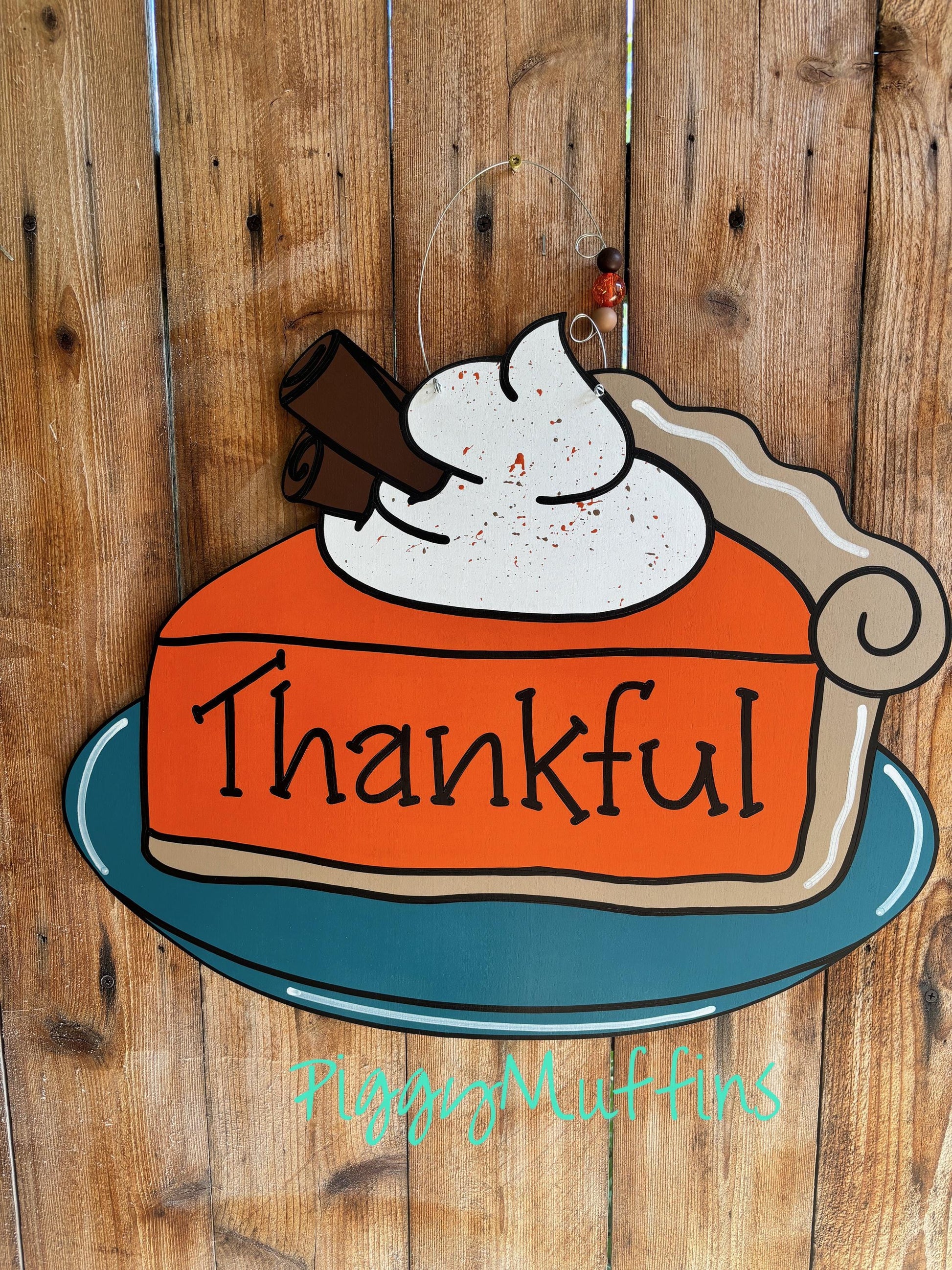 Welcome your family and friends with this adorable little Thanksgiving Pumpkin Pie by PiggyMuffins! This Thanksgiving Door Hanger measures approximately 22 inches in length and 22 inches in width. This sign is hand cut out of 1/4 inch board, sanded and painted with acrylic paint and accented with polyester glitter. It is sealed with a clear protective coating that prevents chipping, peeling, fading, or yellowing. It includes a sturdy wire hanger and coordinating beads and is ready to hang when delivered. A coordinating bow can be added for an additional charge by choosing the "With Bow" option at checkout.