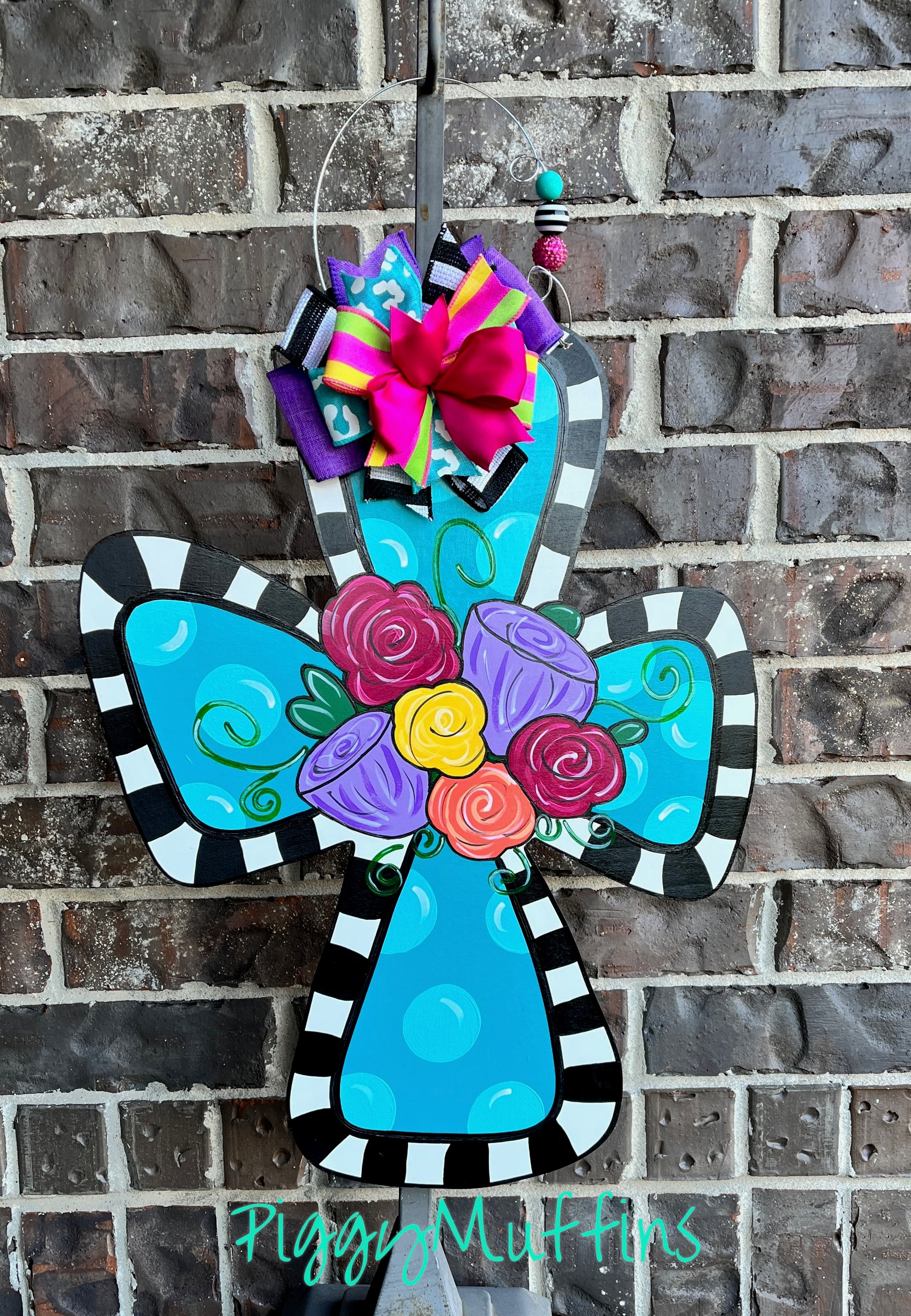 The gorgeous Floral Cross door sign measures approximately 20 inches in length and 17 inches in width. This turquoise and black sign is cut out of 1/4 inch MDF board, sanded and painted with acrylic paint. It is sealed with a clear protective coating that prevents chipping, peeling, fading, or yellowing. It includes a sturdy wire hanger and coordinating beads and is ready to hang when delivered. A coordinating bow can be added for an additional charge by choosing the "With Bow" option at checkout.