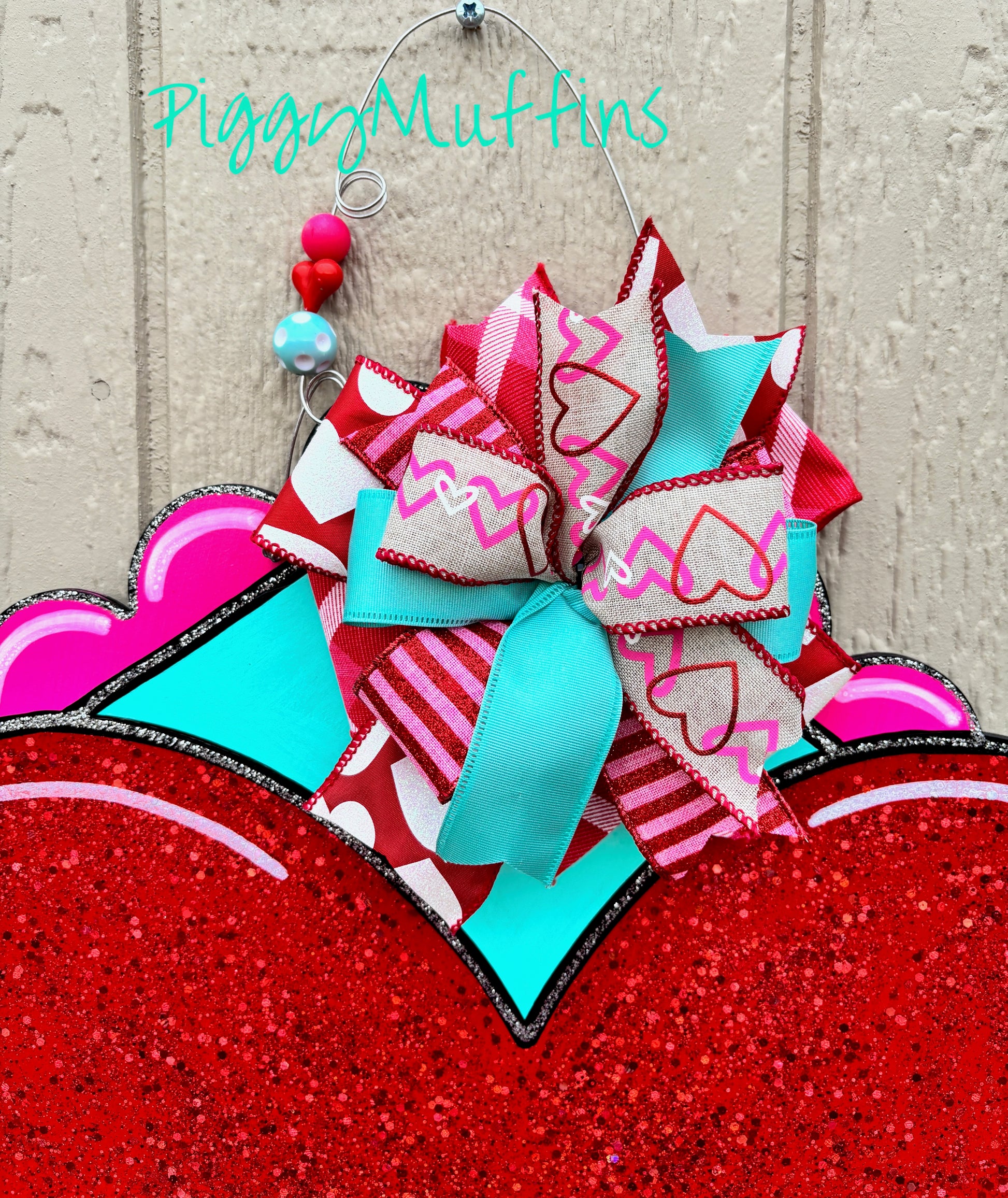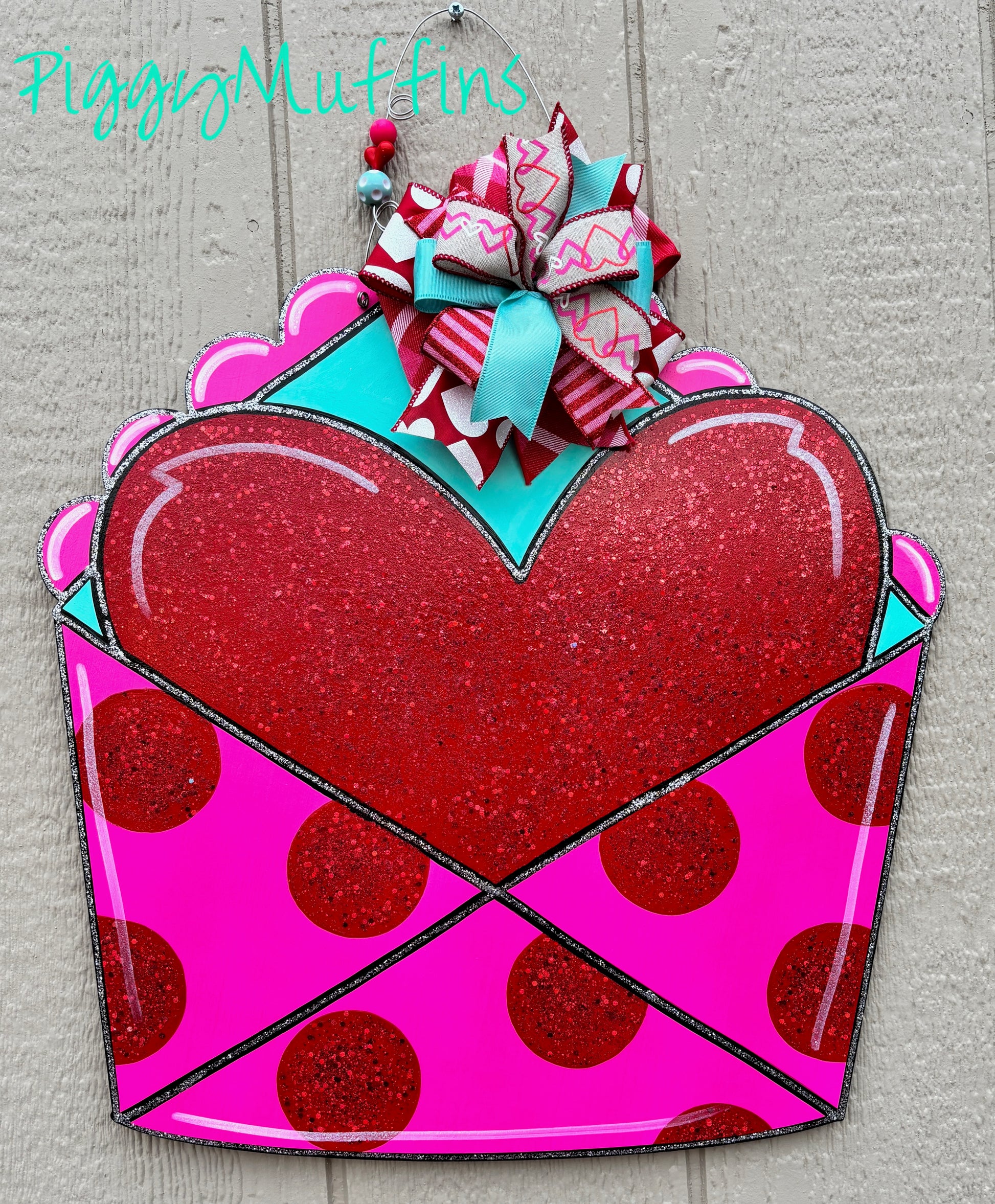 Welcome your guests and be the envy of your neighborhood this Valentine's Day with this gorgeous valentine heart door hanger by PiggyMuffins! This Love Letter sign measures approximately 22 inches in length and 22 inches in width. This sign is cut out of 1/4 inch board, sanded and painted with acrylic paint. It is sealed with a clear protective coating that prevents chipping, peeling, fading, or yellowing. It includes a sturdy wire hanger, bow and coordinating beads and is ready to hang when delivered.