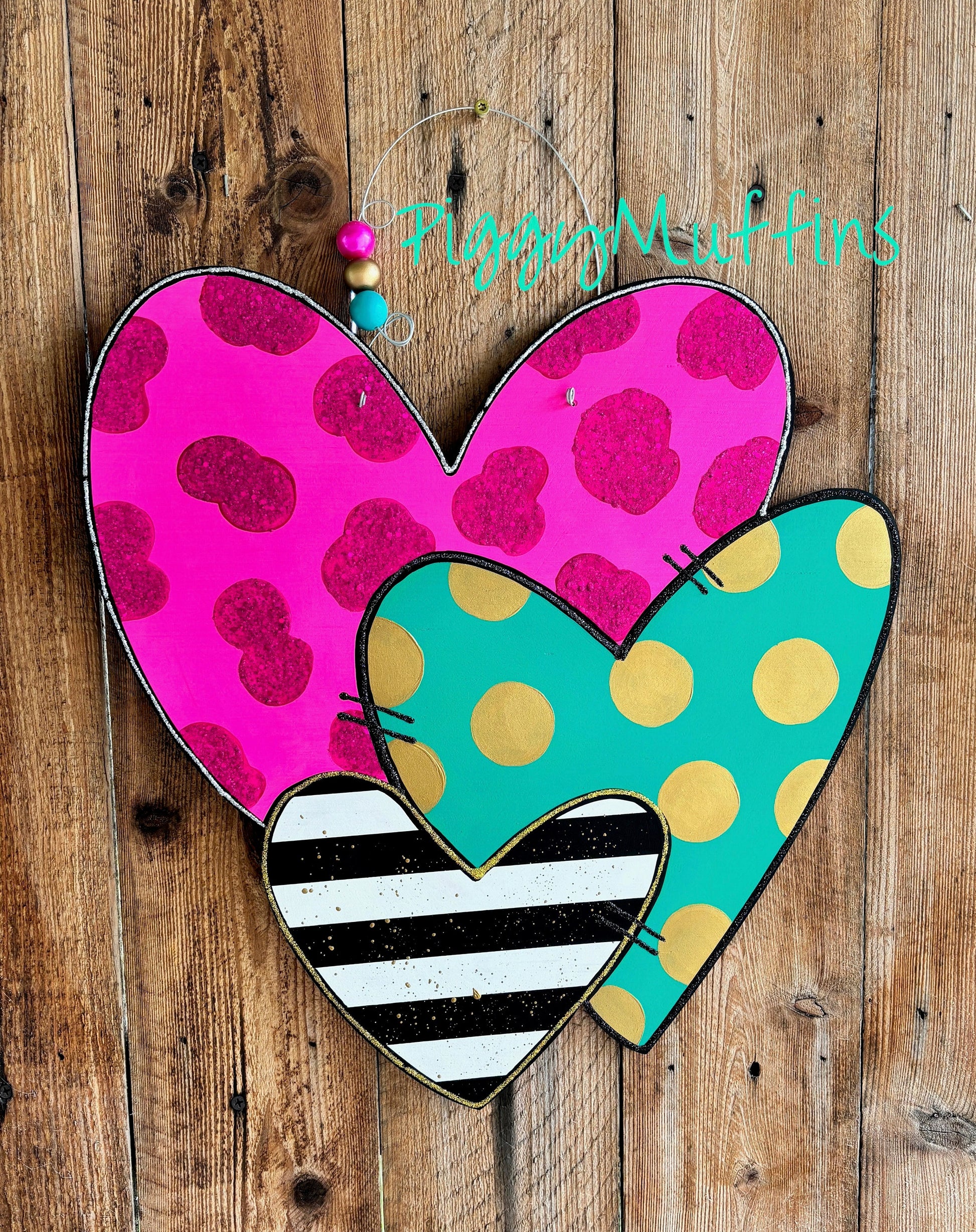 Welcome your guests and be the envy of your neighborhood this Valentine's Day with this adorable triple heart Valentines door hanger by PiggyMuffins! This whimsical Valentine sign measure approximately 22x22 inches. This sign is cut out of 1/4 inch board, sanded and painted with acrylic paint and accented with polyester glitter. It is sealed with a clear protective coating that prevents chipping, peeling, fading, or yellowing. It includes a sturdy wire hanger and coordinating beads and is ready to hang when delivered. A coordinating bow may be added at checkout for an additional fee.
