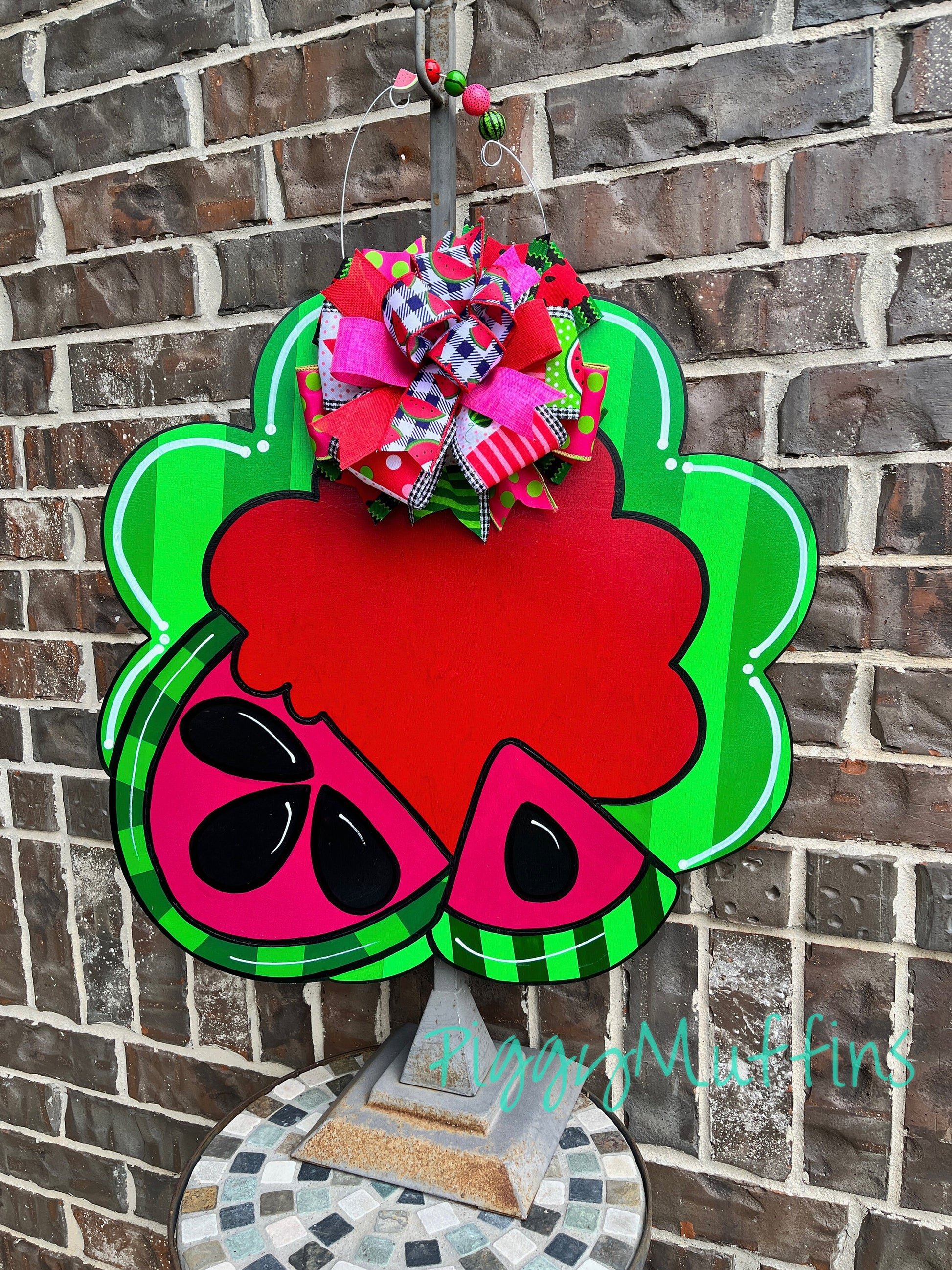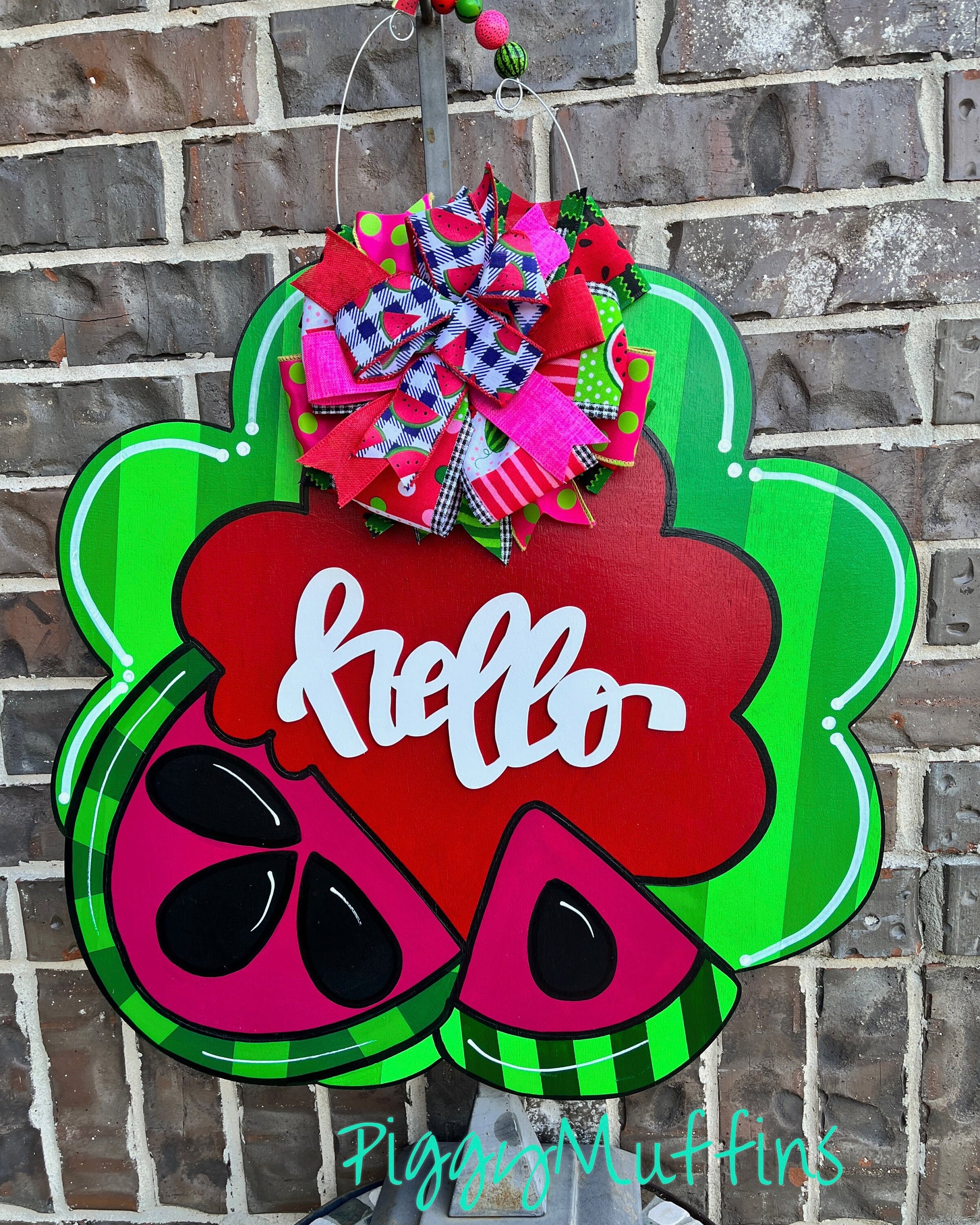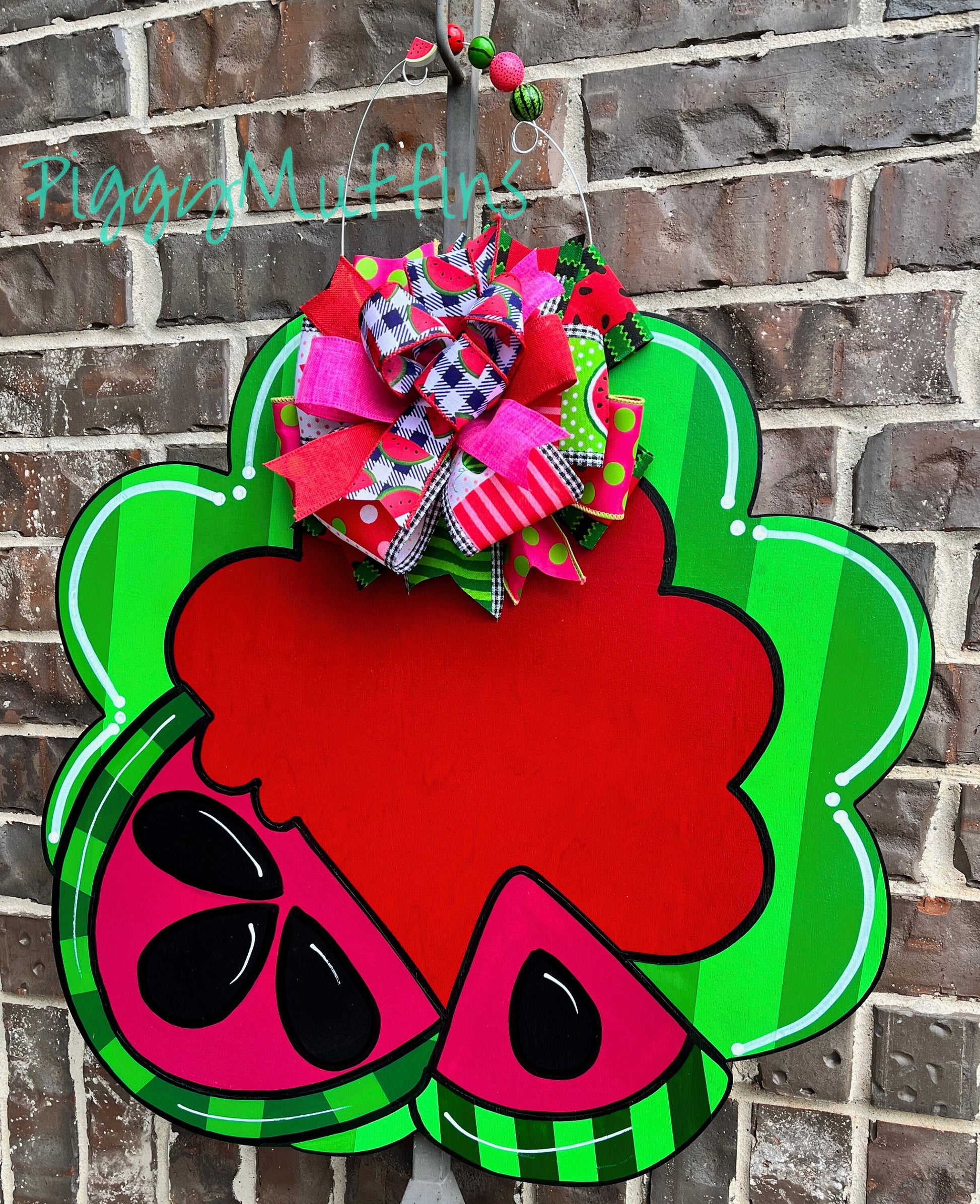 This bright and festive watermelon door hanger by PiggyMuffins is perfect all summer long! This is the cutest customized accessory to dress up your front door, porch decor or backyard patio! This Summer Door Hanger measures 22 inches wide by 22 inches tall and is cut out of 1/4 inch board, sanded and painted with acrylic paint. Accented with floral greenery and faux watermelon slices, it is sealed with a clear protective coating that prevents chipping, peeling, fading, or yellowing. It includes a sturdy wire hanger and coordinating bow and beads and is ready to hang when delivered.