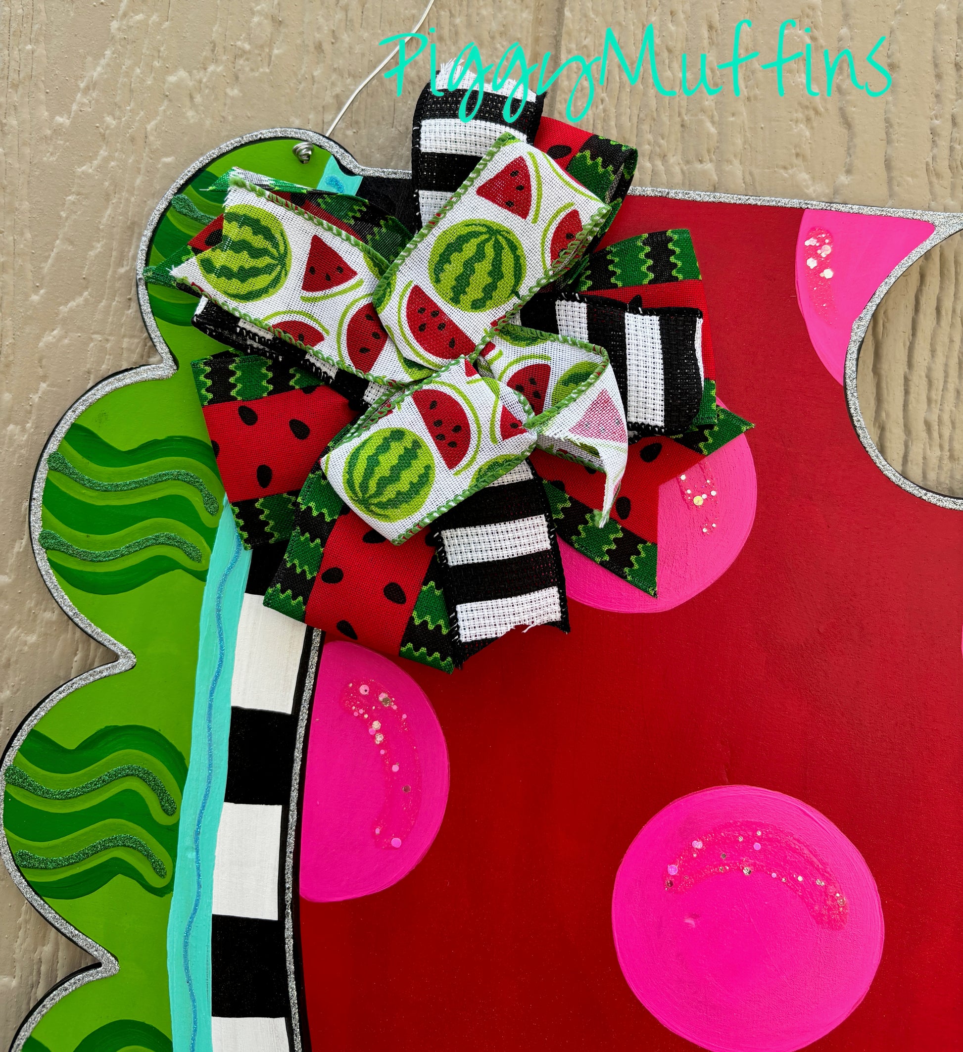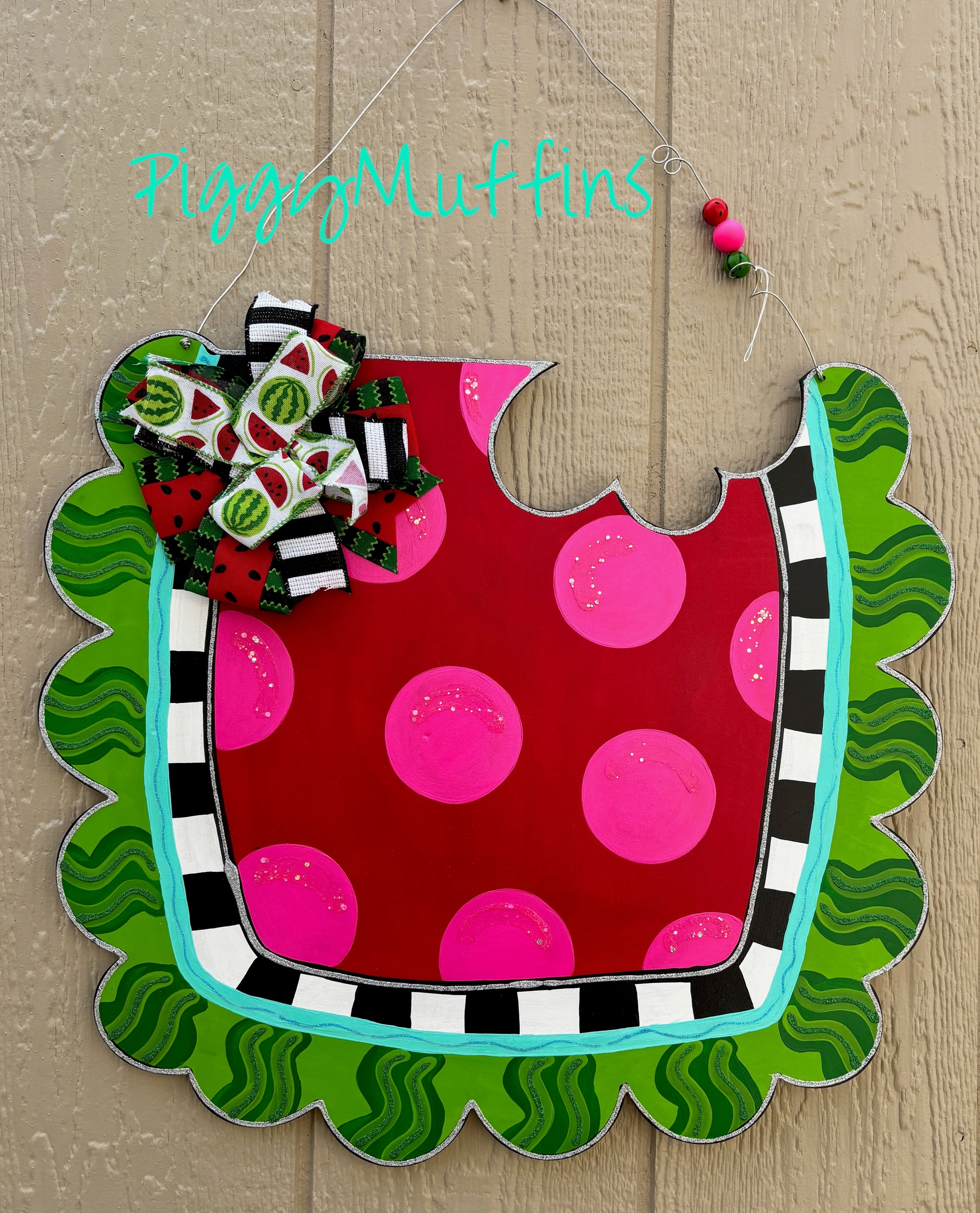 Perfect for summer, this cute whimsical summer watermelon door hanger by PiggyMuffins makes a great gift. The sign measures approximately 22 inches in length and 22 inches in width. This summer watermelon sign is cut out of 1/4 inch plywood, sanded and painted with acrylic paint. It is sealed with a clear protective coating that prevents chipping, peeling, fading, or yellowing. It includes a sturdy wire hanger and coordinating beads and is ready to hang when delivered.
