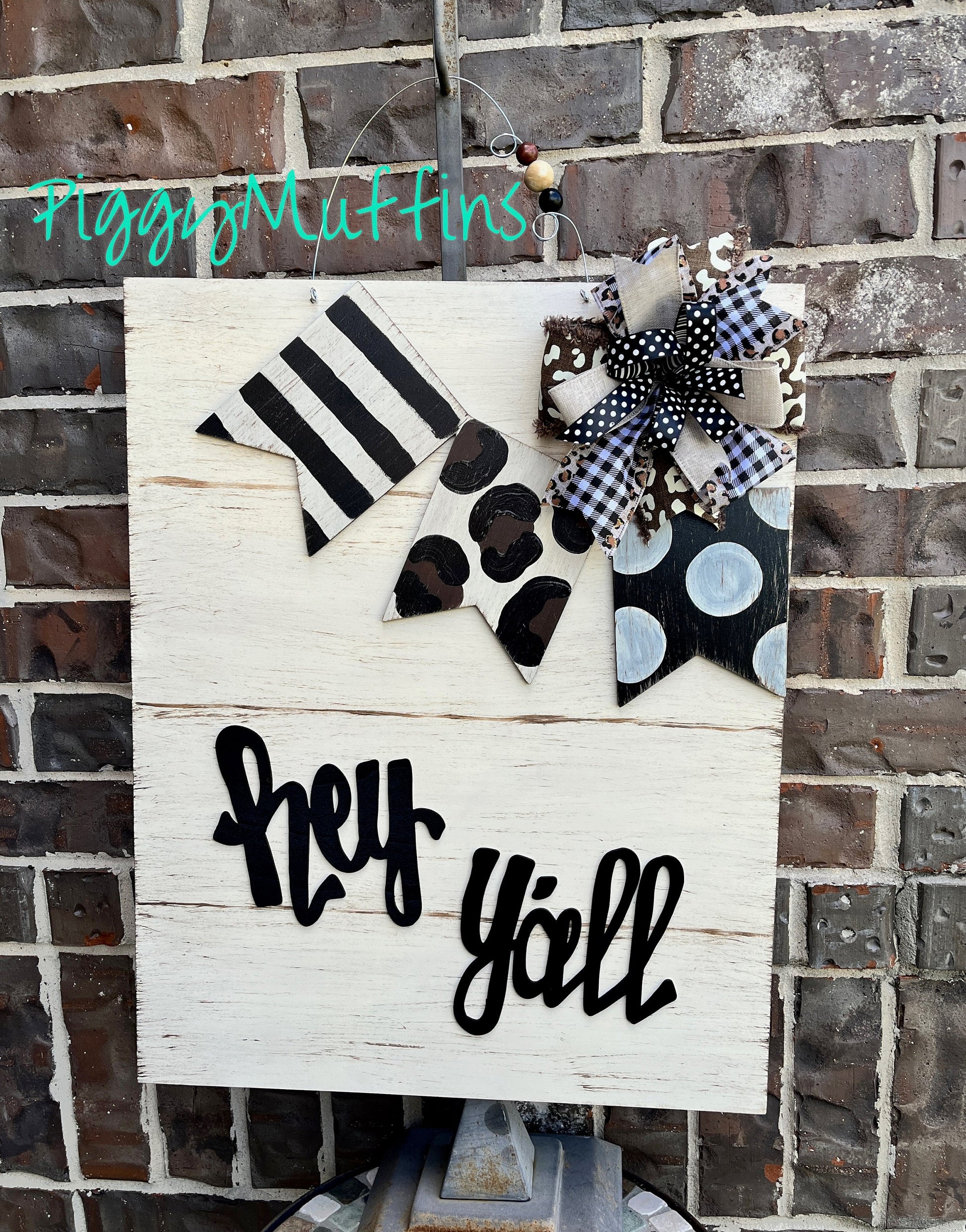 Personalize this gorgeous Country door hanger for the perfect welcome to your home! It also makes the perfect gift!. This 'Hey Y'all' welcome door hanger is cut out of 1/4 inch board, sanded and painted with acrylic paint. It is sealed with a clear protective coating that prevents chipping, peeling, fading, or yellowing. It includes a sturdy wire hanger and coordinating bow and is ready to hang when delivered. A coordinating bow can be added for an additional charge at checkout.