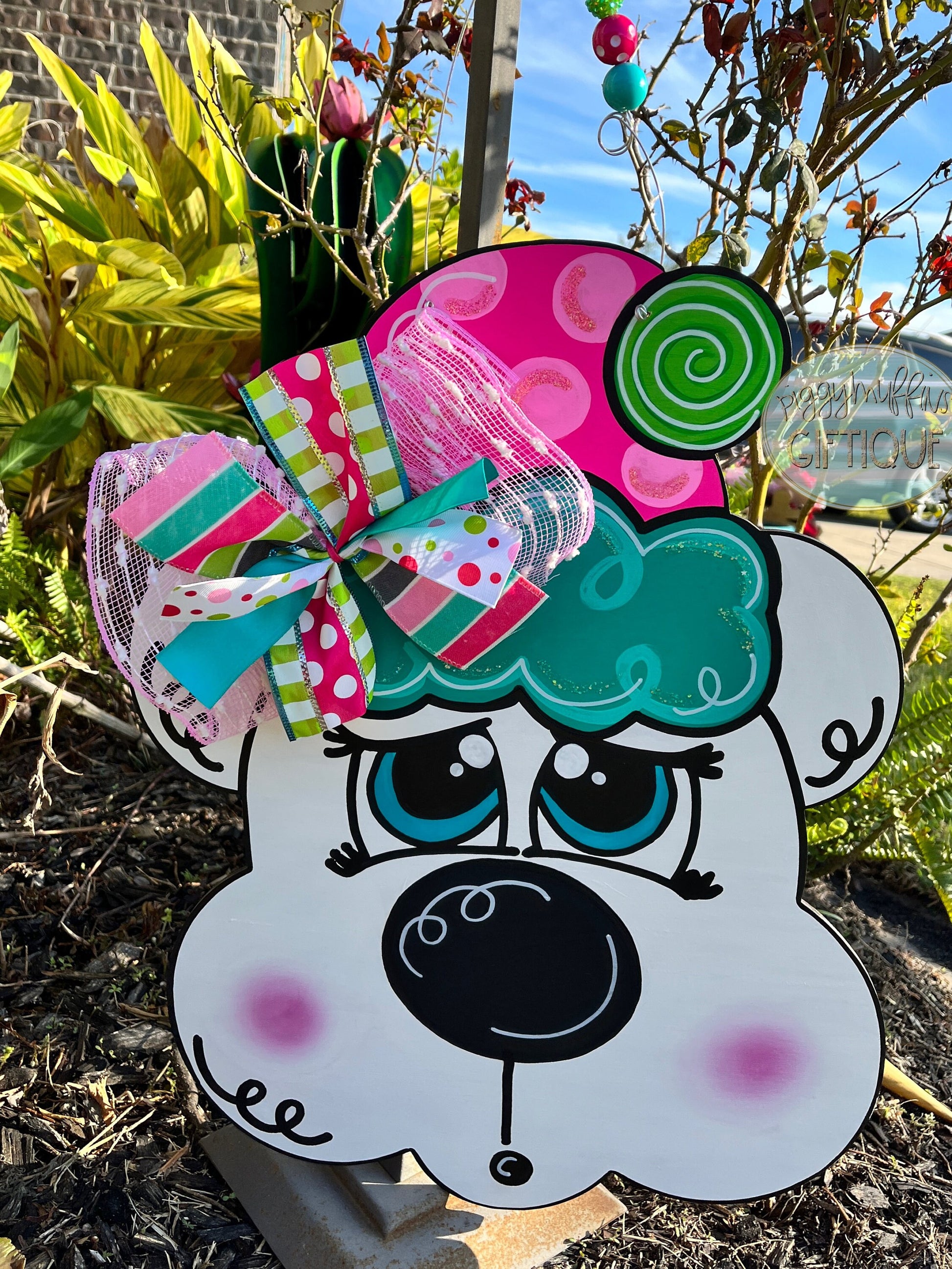 Welcome your guests to all of your Christmas celebrations and be the envy of your neighborhood with this adorable polar bear door hanger! The sign measures approximately 22 inches in length and 22 inches in width. This sign is cut out of 1/4 inch board, sanded and painted with acrylic paint and accented with polyester glitter. It is sealed with a clear protective coating that prevents chipping, peeling, fading, or yellowing. It includes a sturdy wire hanger and coordinating bow and beads and is ready to hang upon delivery.